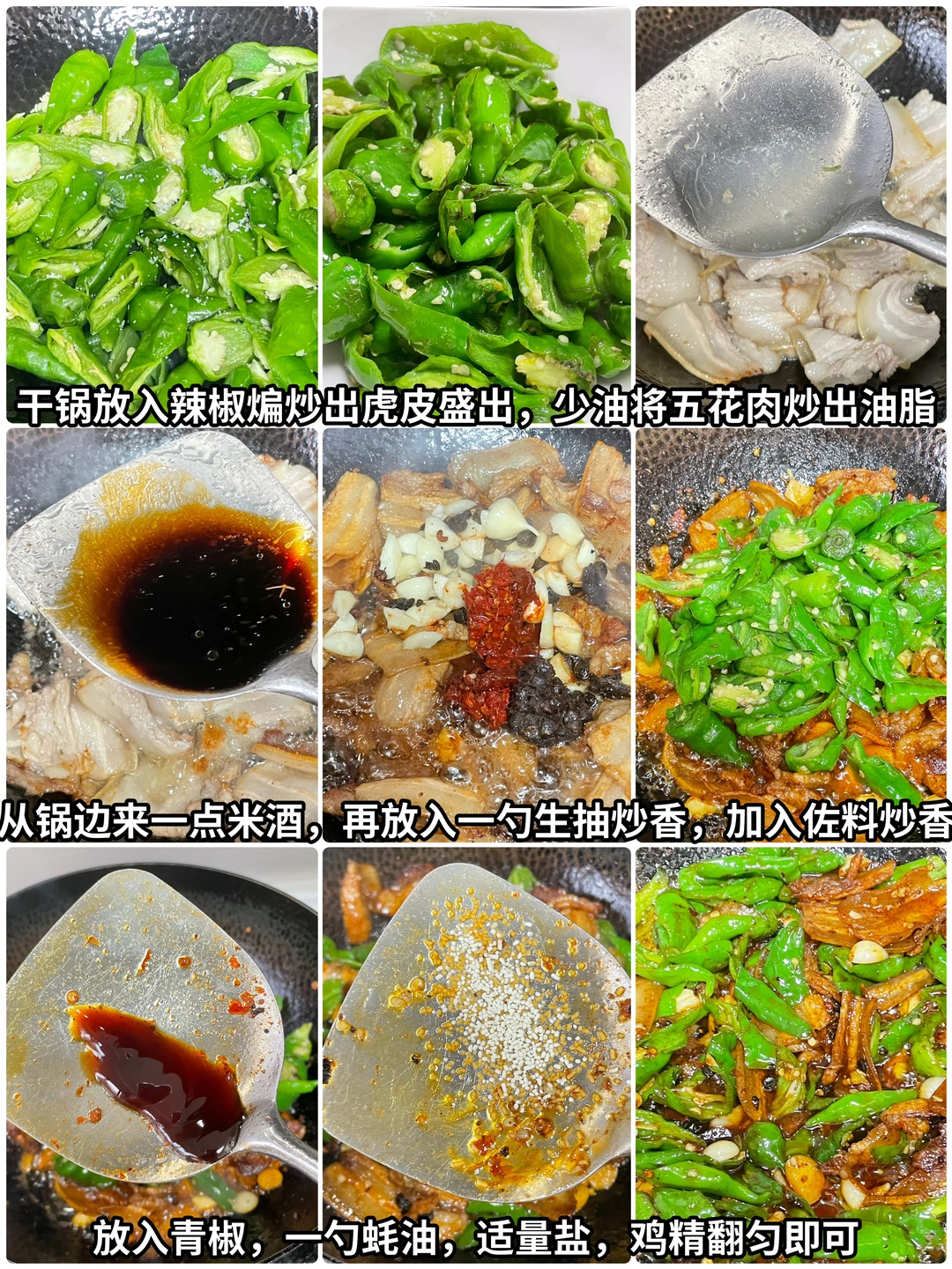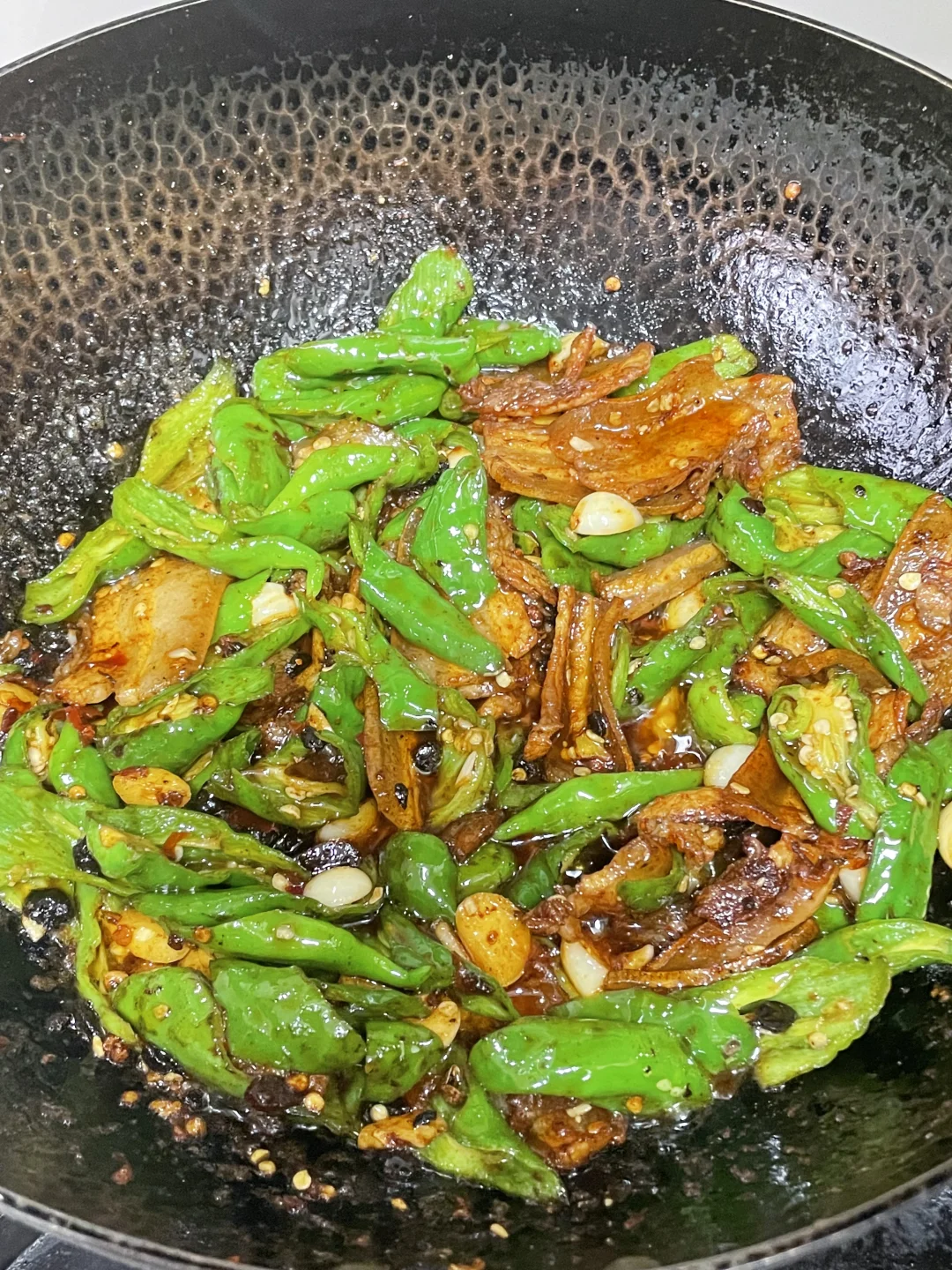 2⃣️起锅干锅,放入辣椒,一点盐,翻炒出虎皮,盛出备用。