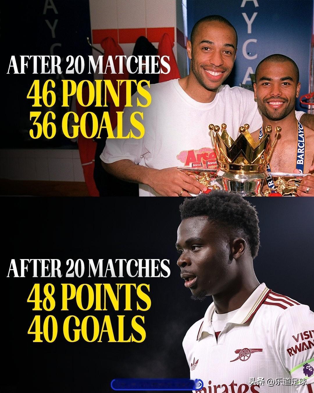 阿森纳上季面对维拉等4队8场仅1胜,如今面对相同对手取得4连胜! 每个赛季都在进步,成功就是每天比昨天好一点点! 经过20场比赛后,阿森纳的积分和进球数都超过了他们在2003/04赛季的不败赛季。 2003-04赛季,20场比赛后:46积分,36个进球; 2025-26赛季,20场比赛后:48积分,40个进球。 最终的结果会一样吗? 🏆