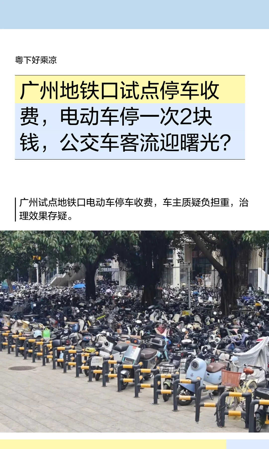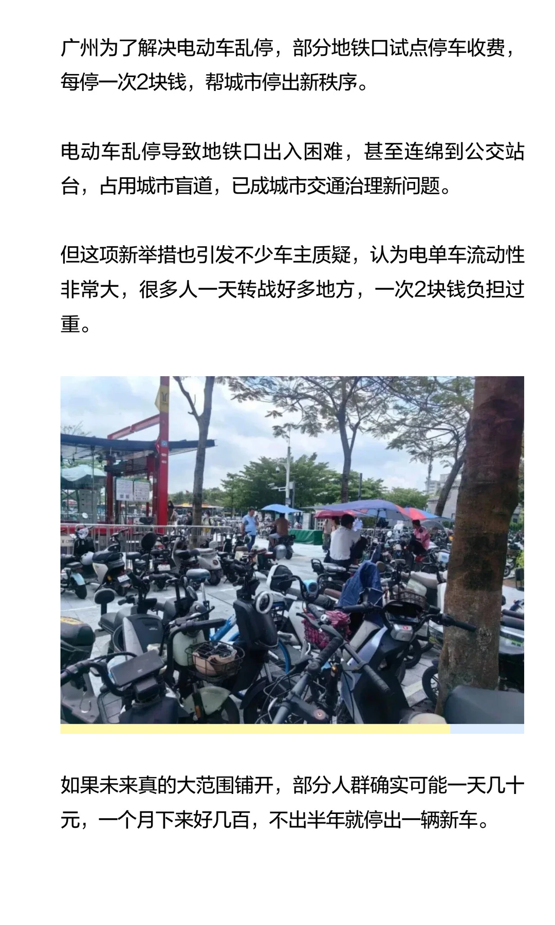 广州地铁口试点停车收费,电动车停一次2块钱。广州为了解决电动车乱停,部分地铁