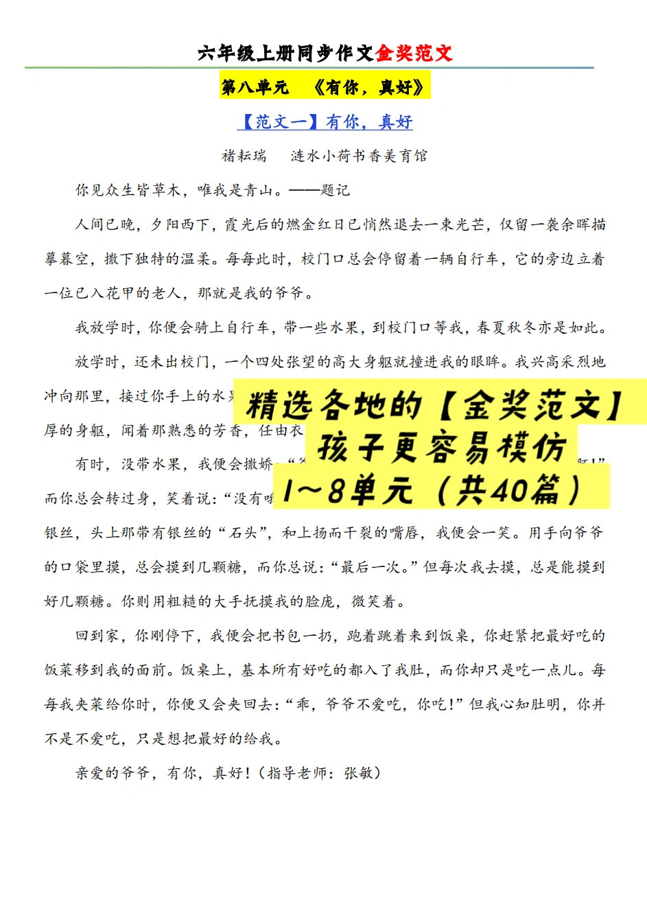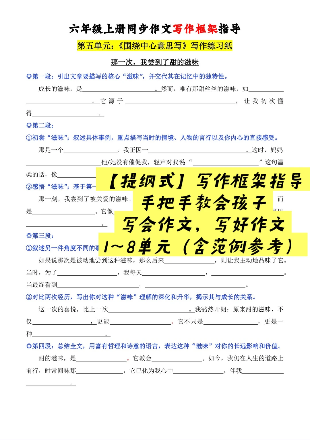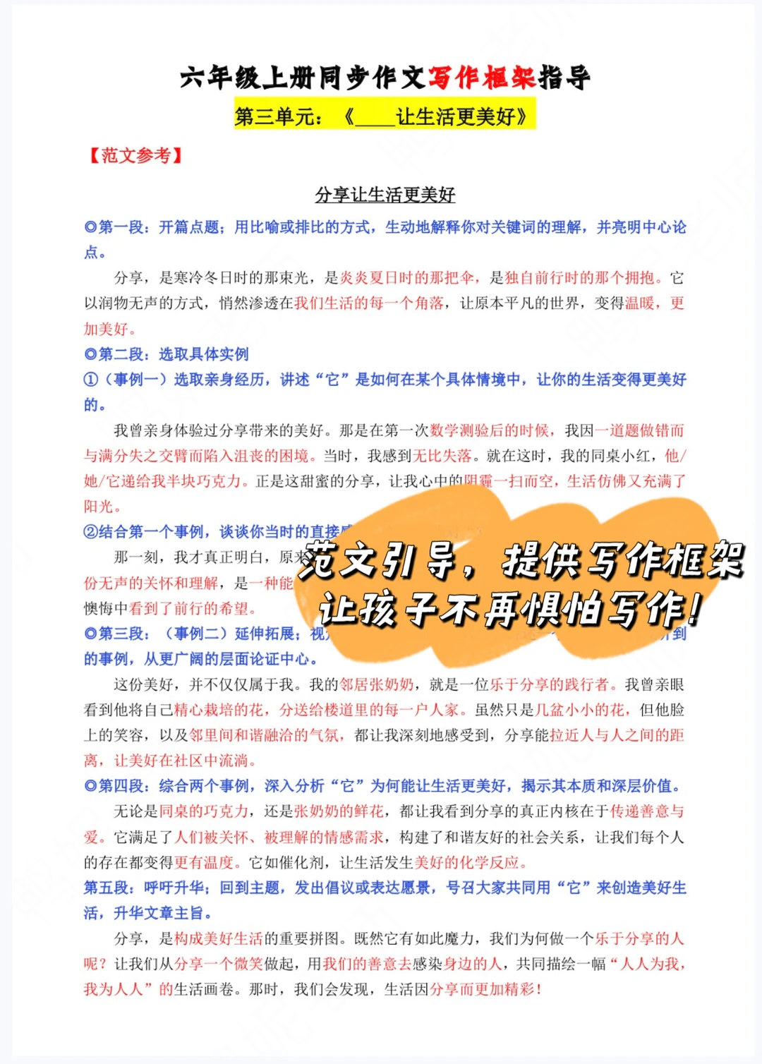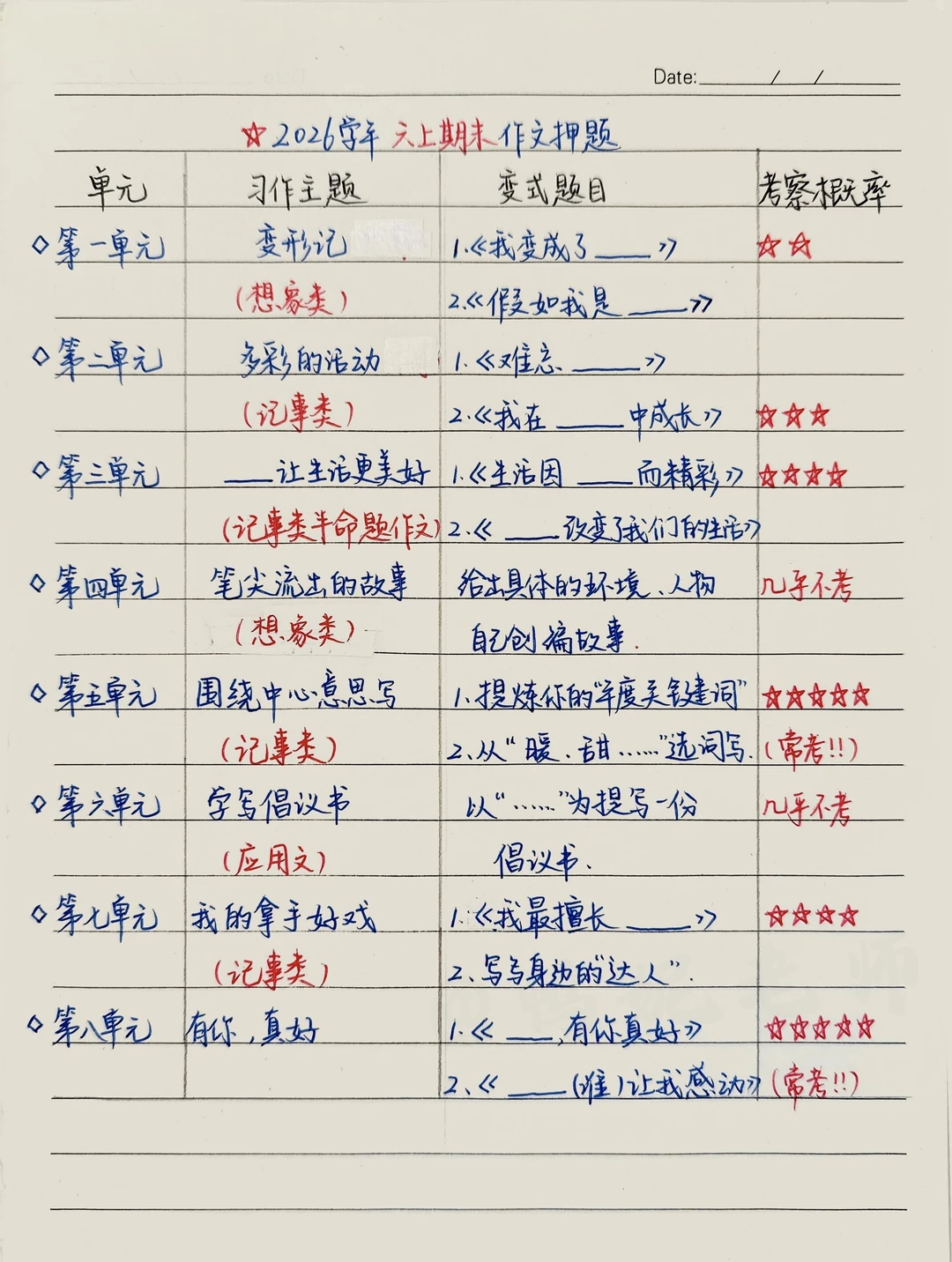 👉考察频率从低到高依次是: 🌟🌟🌟🌟🌟【第五单元】《围绕一个中心意思写》 🌟🌟🌟🌟🌟【第八单元】《有你,真好》 🌟🌟🌟🌟 【第四单元】《___让生活更美好》 🌟🌟🌟🌟 【第七单元】《我的拿手好戏》 🌟🌟🌟 【第二单元】《多彩的活动》 🌟🌟 【第一单元】《变形记》 💡备考小贴士: ‼️考前将考察频率较高的的五个单元作文重点训练 可以采用【提纲式】写作支架过一遍每个作文的要点 帮助孩子构建写作提纲,写好作文中“细节部分” 考前再多读读【金奖范文】,多多积累好词好句。