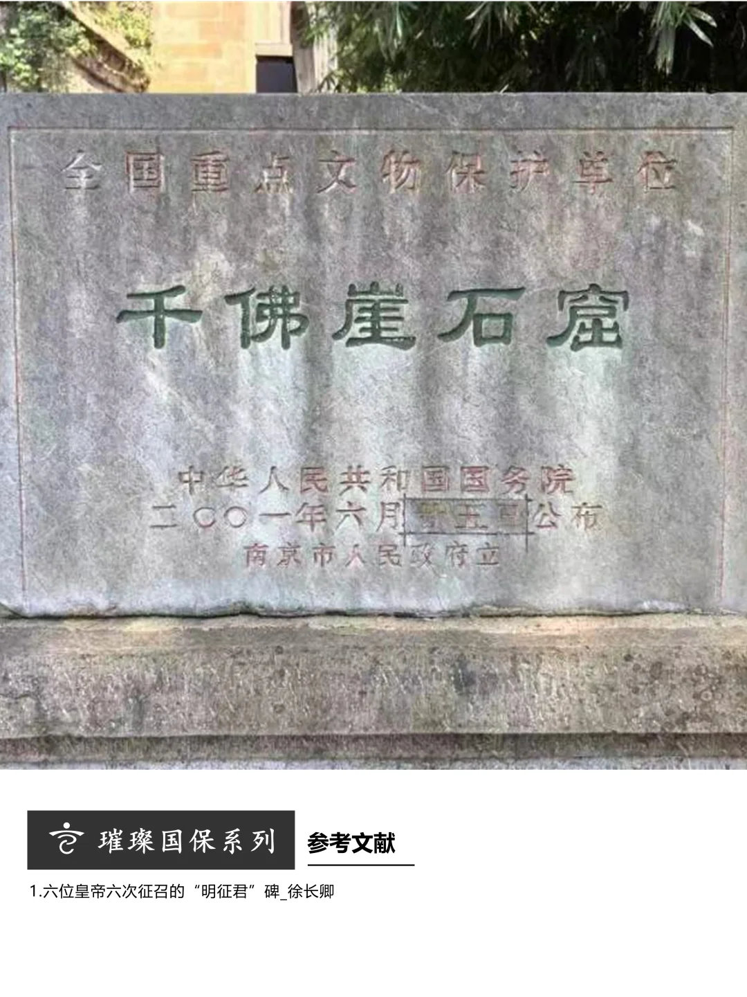 南齐永明元年(公元483年),隐居摄山的明僧绍捐献自宅后院建栖霞精舍。次年,僧绍长子明仲璋与法度禅师于西峰石壁开凿石窟,经过齐梁开凿,形成了千佛崖石窟,千佛崖石窟也是我国东南地区开凿年代最早、规模最大的石窟寺。唐高宗李治在他宠信的大臣、明僧绍的裔孙明崇俨的恳请下御笔亲书了明征君墓,碑文介绍了明僧绍的一生事迹以及齐梁两代在栖霞山大造佛像等活动,由唐代大书法家高正臣书丹,是南京地区保存最为完好的唐代石碑。