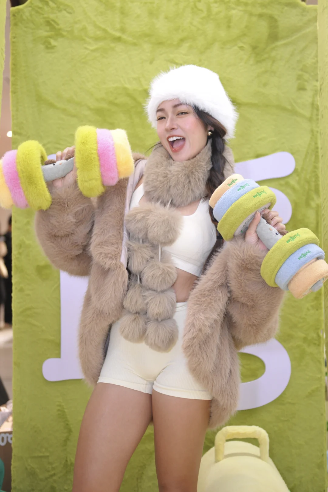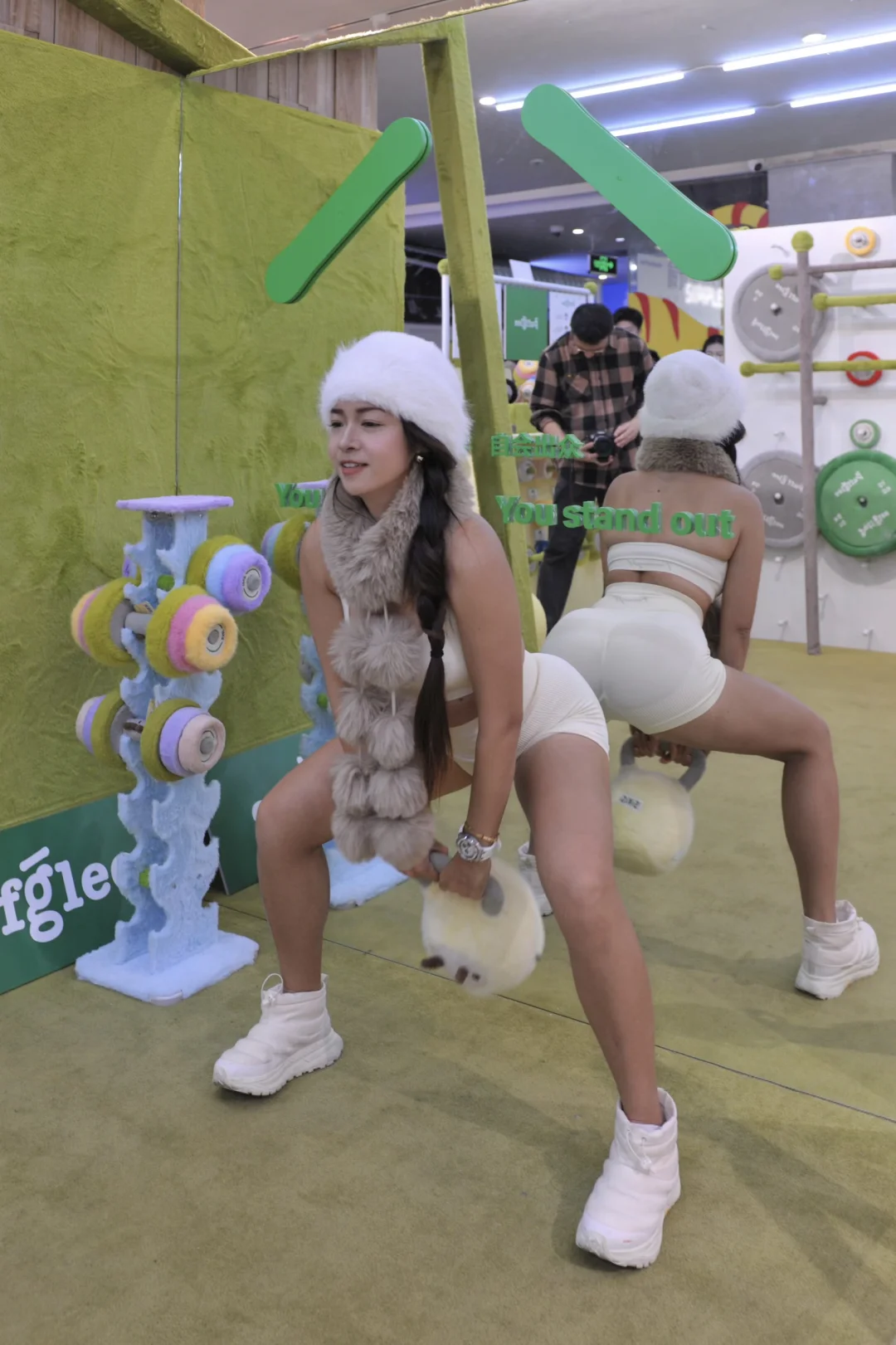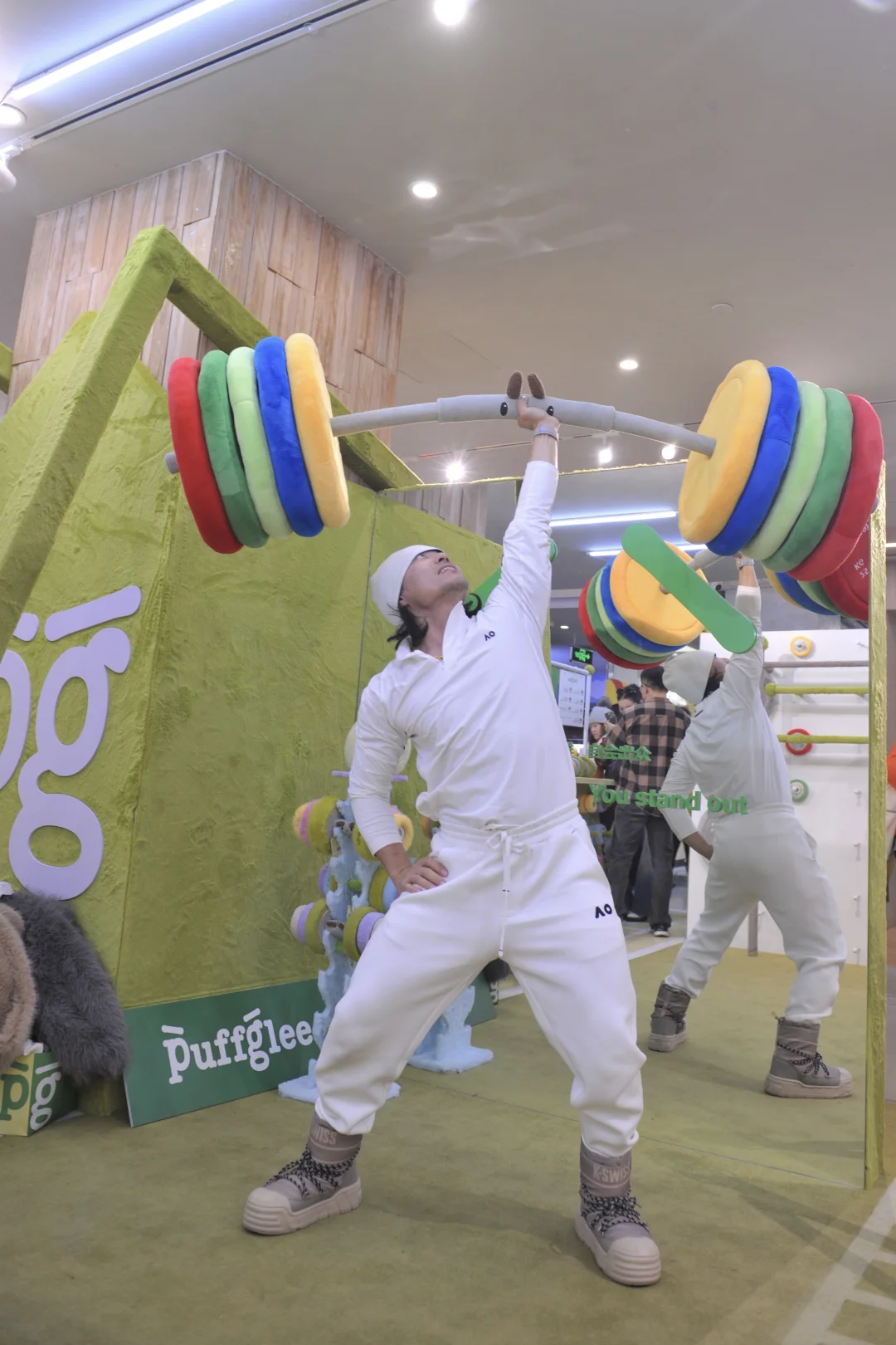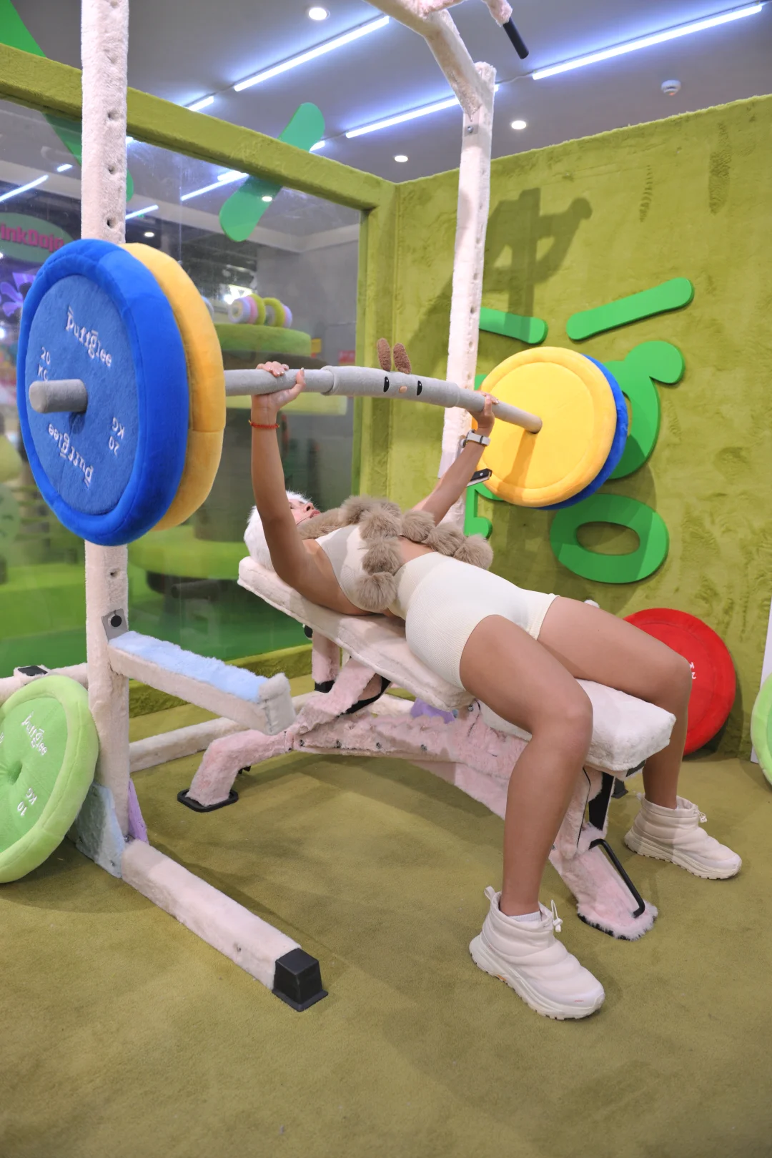 还能在教练指导下举起巨型毛绒杠铃拍照