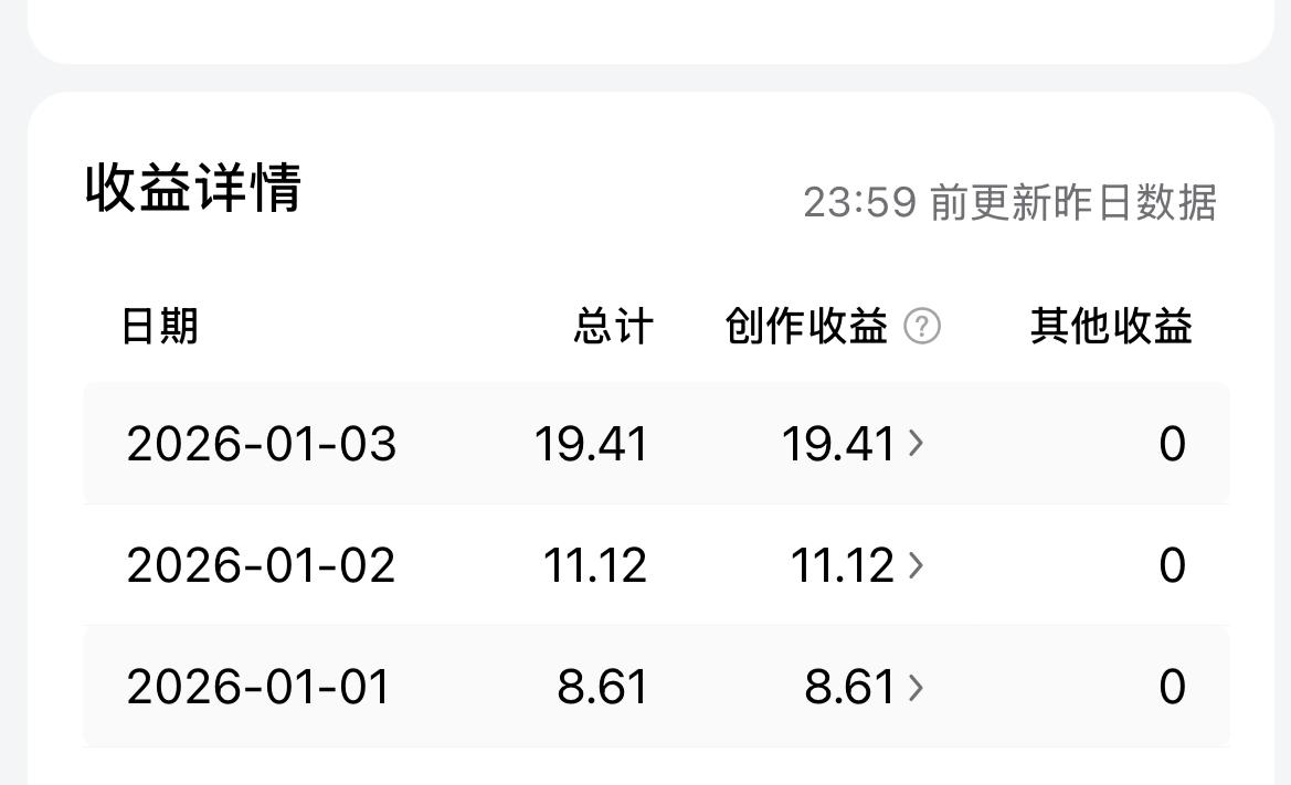 昨日收益已出来。 2026年开年头三天, 这三日收益都不错, 第一天收益¥8.61, 第二天收益¥11.12, 第三天收益¥19.41, 真是芝麻开花节节高! 今日收益明天才会出来,估计不可能比昨日收益更高,今天发布的内容都没有什么展现,顺其自然吧。 今天是阴天,一整天都没有出去。晚饭后跟儿子视频,告诉他,这个月我有空去他那里给他做饭啥的,他竟然说他一日三餐都在公司吃又不在家里吃饭,说的倒也事实,但也明摆着并不欢迎我这为娘的去打扰他的生活。 我就偷偷乐着吧:年轻人有年轻人的生活,该交女朋友该谈恋爱了,做父母的怎么好意思去打扰年轻人的生活呢?祝福我的孩子:立业成家,喜乐安康,万事皆可期!