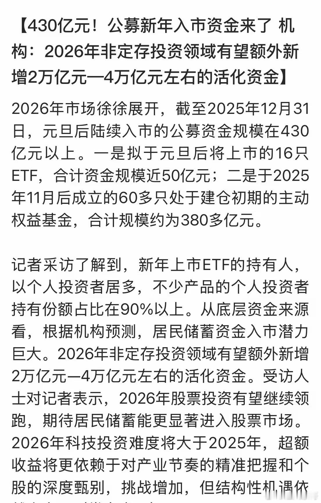 新年开市,就有430亿元的公募资金等着买入股市!据统计,元旦前有60多只处于建仓初期的主动权益基金,合计规模约为380多亿元,元旦后将上市的16只ETF,合计资金规模近50亿元,新年前后合计可投市场资金430亿元。机构还预测2026年民居存款搬家股市规模在2万亿元至4万亿元左右。从以上数据分析来看,2026年入市初始资金规模不低4万亿元进入市场,并且2025年末国际外资投行异口同声一致看好中国股市,有意愿持续买入中国资产。参照豆包统计2025年国际投行净投中国股票约5200亿元人民币(约720亿美元)。依据2025年外资投资中国股市资金,来预测2026年的流入中国股市资金,大约在有3500亿人民币(约490亿美元)以上。2026年A股有如此多的资金为市场准备着,超越2025年的上涨幅度不是没有可能的,A股上涨直指5000点!