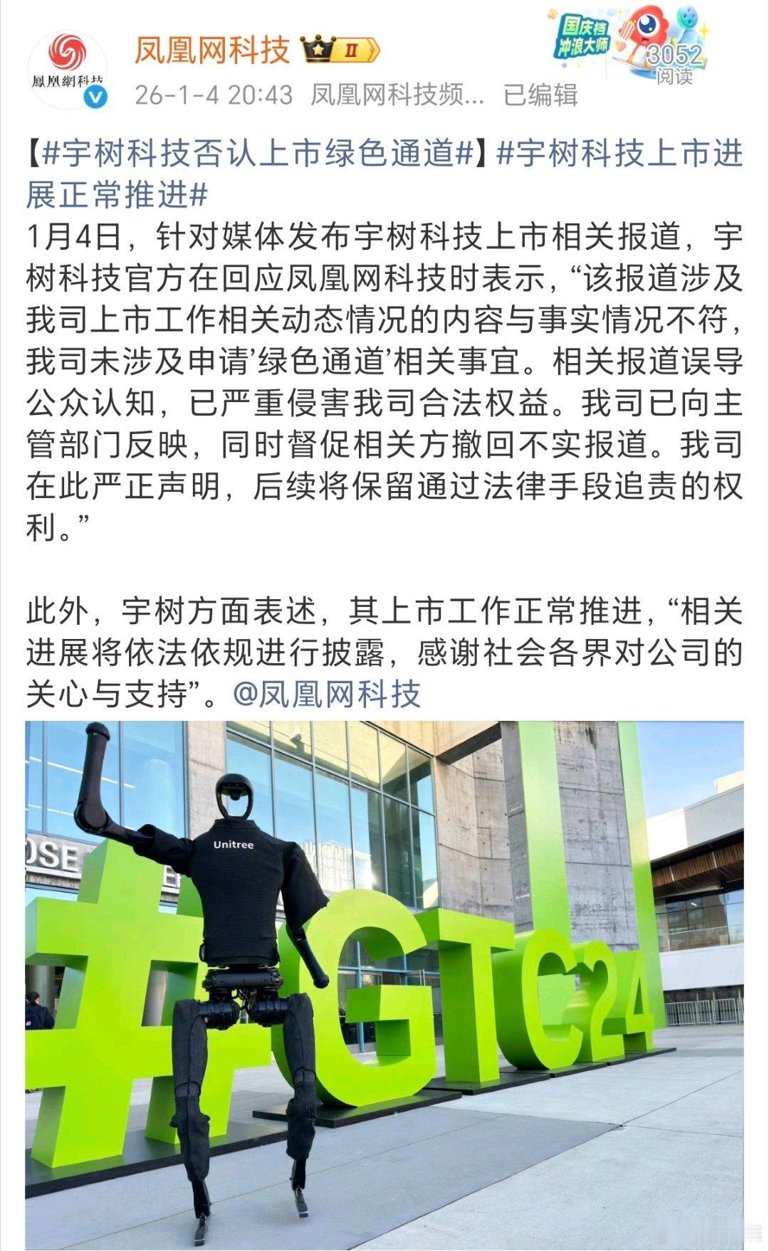 宇树科技没有申请过上市绿色通道闹乌龙了?1月4日,网易科技频道发布了一条关于宇树科技上市的所谓独家消息(见图2):宇树科技A股上市的绿色通道被叫停,但上市并未叫停。然而,事情迎来了反转,据凤凰网科技(见图3),1月4日,针对媒体发布宇树科技上市相关报道,宇树科技官方在回应凤凰网科技时表示,“该报道涉及我司上市工作相关动态情况的内容与事实情况不符,我司未涉及申请’绿色通道’相关事宜。相关报道误导公众认知,已严重侵害我司合法权益。我司已向主管部门反映,同时督促相关方撤回不实报道。我司在此严正声明,后续将保留通过法律手段追责的权利。”此外,宇树方面表述,其上市工作正常推进,“相关进展将依法依规进行披露,感谢社会各界对公司的关心与支持”。那么问题来了,网易科技这是在造谣吗?宇树科技澄清科技先锋官