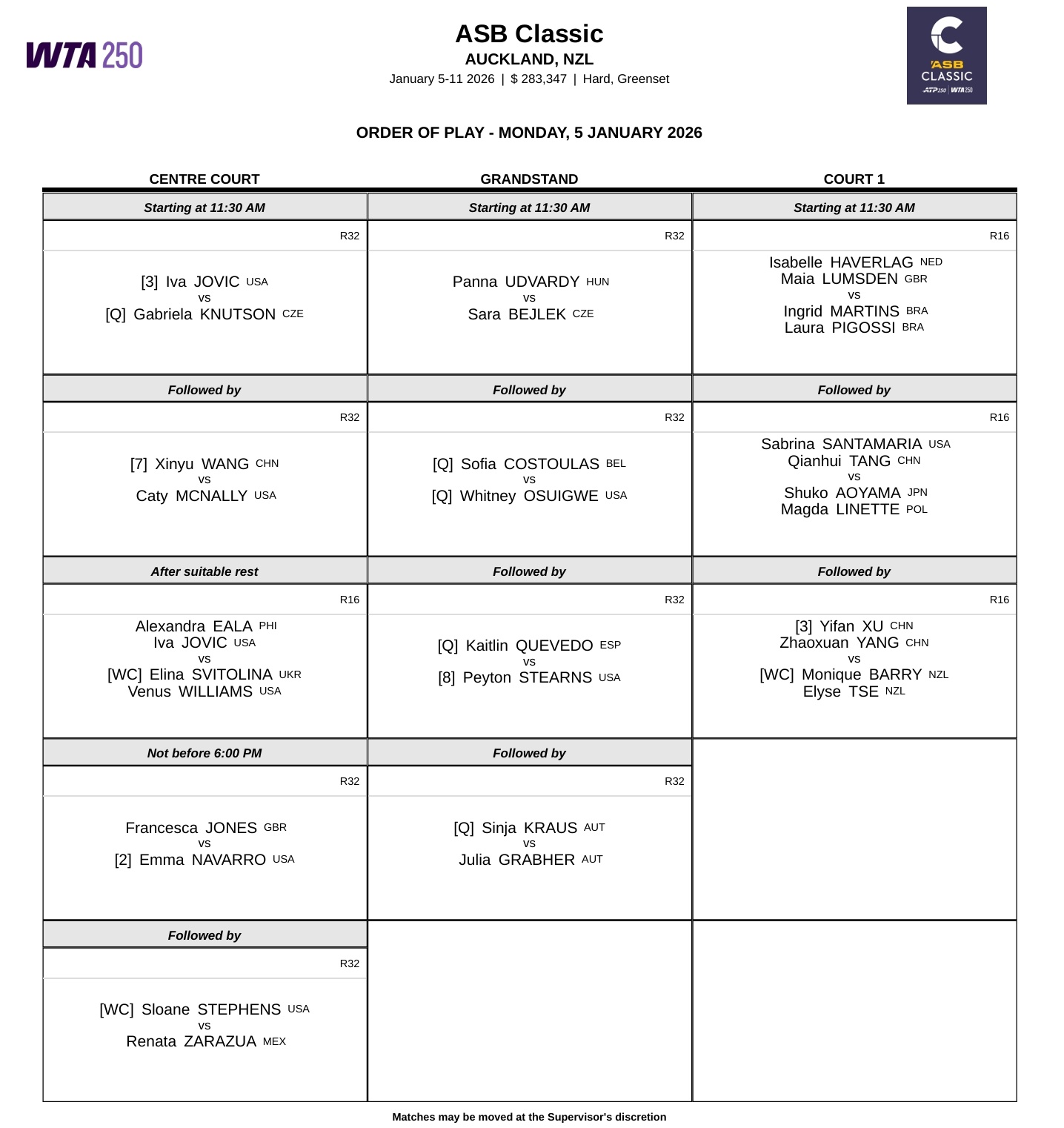 周一赛程📅布里斯班站首轮继续,张帅对阵克鲁格,普利斯科娃、万卓索娃、卡林斯卡娅等球员亮相。奥克兰站正式挥拍,王欣瑜、纳瓦罗等球员迎来赛季首秀,大威/斯维托丽娜出战双打。以下安排均为北京时间👇🎾WTA500布里斯班站📍帕特·拉夫特球场9:00 - [W]比勒尔 vs [Q]斯拉姆科娃预计18:00 - 玛利亚 vs [W]琼斯📍1号场预计10:30 - [Q]盖德基 vs 李吉妮随后 - 卡·普利斯科娃 vs 巴普蒂斯特预计16:00 - 雅斯特雷姆斯卡 vs [W]吉布森📍2号场9:00 - [Q]张帅 vs 克鲁格随后 - [Q]邦达尔 vs 布克沙随后 - [Q]萨斯诺维奇 vs 布林科娃随后 - 瓦伦托娃 vs 卡林斯卡娅随后 - 万卓索娃 vs 弗莱彻🎾WTA250奥克兰站📍中心场6:30 - 约维奇 vs [Q]努特森随后 - 王欣瑜 vs 麦克纳莉适当休息后 - 伊埃拉/约维奇 vs 斯维托丽娜/大威廉姆斯不早于13:00 - 琼斯 vs 纳瓦罗随后 - [W]斯蒂文斯 vs 扎拉祖阿📍大看台球场6:30 - 乌德瓦尔迪 vs 贝莱克随后 - [Q]克斯特拉斯 vs [Q]奥斯维圭随后 - [Q]克维多 vs 斯特恩斯随后 - [Q]克劳斯 vs 格拉布赫尔