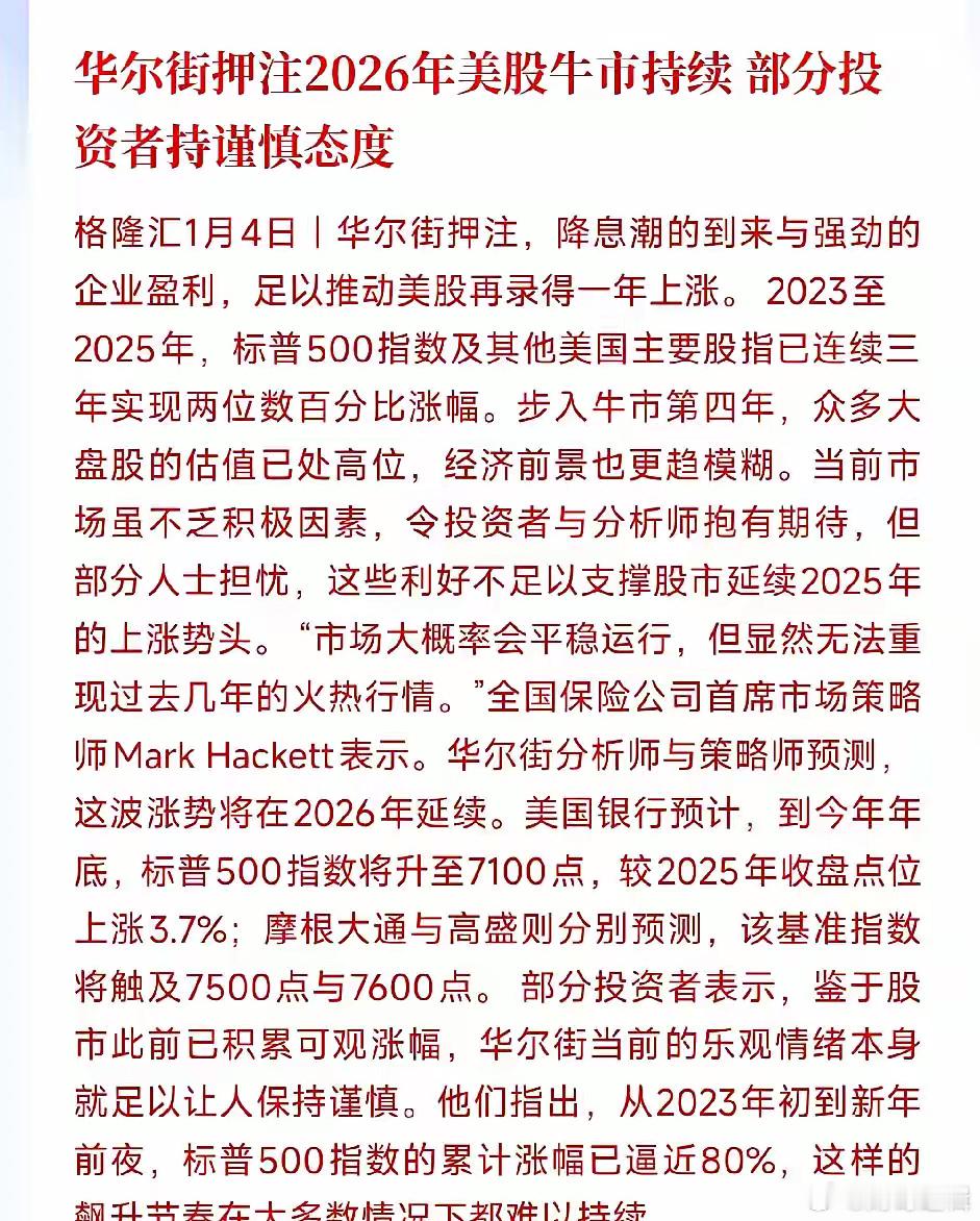 华尔街再次押注2026年将会延续牛市行情,但投资者担忧色居多最新消息,华尔街交易员再次押注2026年会继续延续牛市,并预测标普500将会突破7100点。主要原因就是:美联储的降息周期还在,2026年将会至少两次降息,而且企业的盈利也在增加。事实上,现在降息周期虽然还在,但是预期并不是很好,而且能够盈利的企业大多都是科技股,其他方面都是大企业在盈利,小企业在被积压。投资者的担忧:已经连续涨了几年,很多公司都处于高估值的空间,再往上涨就是风险,需要回调释放风险,并且回归估值。