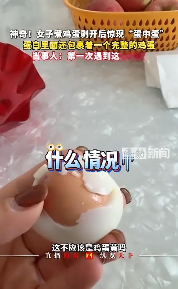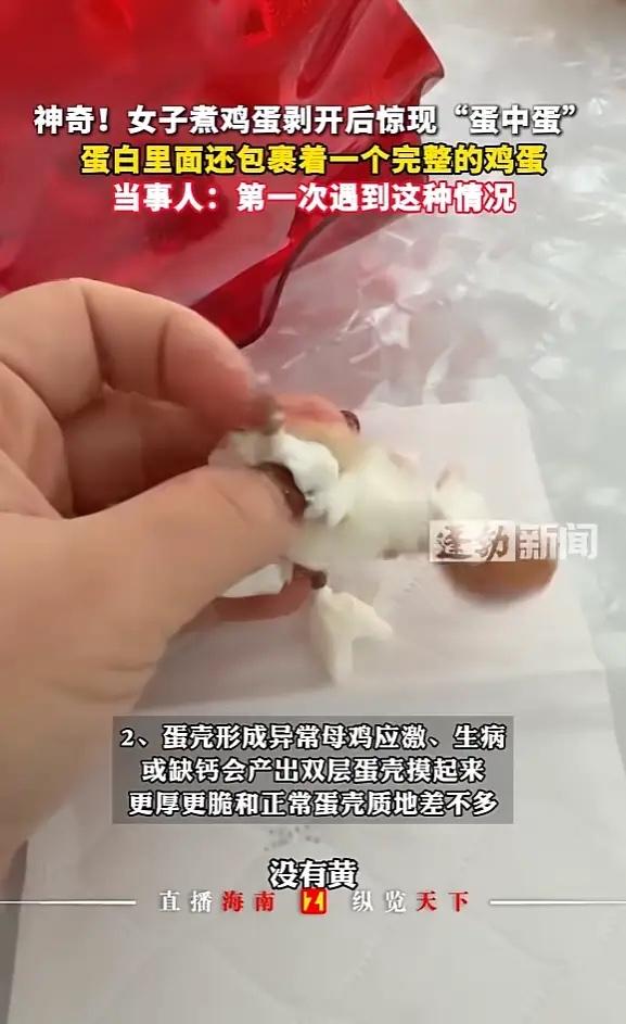“开眼界了!”近日,山东威海,一女子吃鸡蛋时,剥开蛋白后,发现里面并不是蛋黄,而是一枚完整的小鸡蛋,这让女子觉得惊奇,拿出来仔细观察后,发现里面并没有蛋黄,害怕吃了出问题,女子还是将整个蛋扔掉了。网友:鸡蛋界的“套娃”! 邢女士家里养了几只土鸡,现在大家都偏爱原生态的吃食,她也不例外,为了让鸡下的蛋干净又营养,她从来不给鸡喂市面上的饲料,平日里都是喂些玉米粒、新鲜菜叶子,让鸡在院子里散养着。 这样养出来的鸡,下的蛋口感好、吃得也放心,家里日常吃的鸡蛋全靠这几只“功臣”供应,平时剥鸡蛋,顶多就是遇上双黄蛋,就够让人觉得运气不错了,谁也没往更奇特的方向想过,直到那天早上,意外发生了。 那天和往常的清晨没什么不一样,邢女士从鸡窝里捡了几个新鲜鸡蛋,下锅煮熟后,就端上桌准备当早餐,趁着鸡蛋还热乎,她随手拿起一个剥了起来,外层的蛋壳顺着指尖慢慢脱落,白嫩的蛋白露了出来,一切都显得再平常不过。 可就在她准备咬下第一口时,手指触碰到蛋白深处的触感却不对劲了,不是蛋黄该有的绵密感,反倒硬邦邦的,像是藏着个小石子。 这奇怪的手感一下子勾起了邢女士的好奇心,也让她多了几分谨慎,她放慢动作小心翼翼地把外层的蛋白一点点扒开,想看看里面到底藏着什么东西。 随着蛋白层逐渐剥离,眼前的景象让她瞬间愣住了,原本该是蛋黄的位置,竟然裹着一枚完整的小鸡蛋,带着薄薄的蛋壳,色泽、质地都和普通鸡蛋一模一样,就是尺寸被缩小了一圈,迷你又精致。 长这么大从没见过这种场面,邢女士越看越觉得新奇,拿着这枚“蛋中蛋”翻来覆去地观察,她心里忍不住琢磨,这小鸡蛋里面会不会也有蛋黄?带着这份疑问她轻轻敲开了这枚迷你小蛋,可结果又一次超出了她的预料,小鸡蛋里面空空荡荡的,别说蛋黄了连一点蛋液都没有,就是个纯粹的空心蛋。 原本的新奇感瞬间掺进了几分顾虑,邢女士盯着这枚层层嵌套又空空如也的怪蛋,心里犯起了嘀咕,虽说这是自家土鸡下的蛋,饲料干净、来源靠谱,可长得这么违背常理,万一吃了对身体不好可就麻烦了,食品安全这事,终究是不能马虎的,哪怕这颗蛋再罕见、再特别,也比不上身体健康重要。 纠结了一番后,邢女士还是决定不冒这个险,她拿出手机,对着这颗奇特的“蛋中蛋”拍了段视频留作纪念,毕竟这种稀罕事可不是谁都能遇上的,拍完视频后,她就把这颗层层剥开的怪蛋连同外壳一起,扔进了垃圾桶,彻底断了食用的念头。 这段视频被发到网上后,很快就引发了网友们的热议,评论区一下子热闹了起来,不少网友纷纷打趣,说这简直是鸡蛋界的“套娃”现场,层层递进,惊喜(或者说惊吓)不断,还有人感慨,能碰到“蛋中蛋”的概率,比中彩票还低,邢女士这运气也太特别了,尤其是在这个时候,多像新年里的特别预兆。 也有不少网友觉得惋惜,说这么罕见的东西,哪怕不敢吃,留着做个小标本或者摆着观赏也好,扔了实在太可惜了,这辈子说不定就只能见这一次,不过也有网友表示理解邢女士的做法,食品安全大于一切,再稀罕的东西,只要有一丝顾虑,果断扔掉才是最稳妥的选择。 其实不管是觉得新奇还是惋惜,这件事都算是自然界里的小意外,邢女士的谨慎无可厚非,而这枚奇特的“蛋中蛋”,也让大家在平淡的日子里,多了一件值得讨论的新鲜事,也算给生活添了点不一样的乐趣。