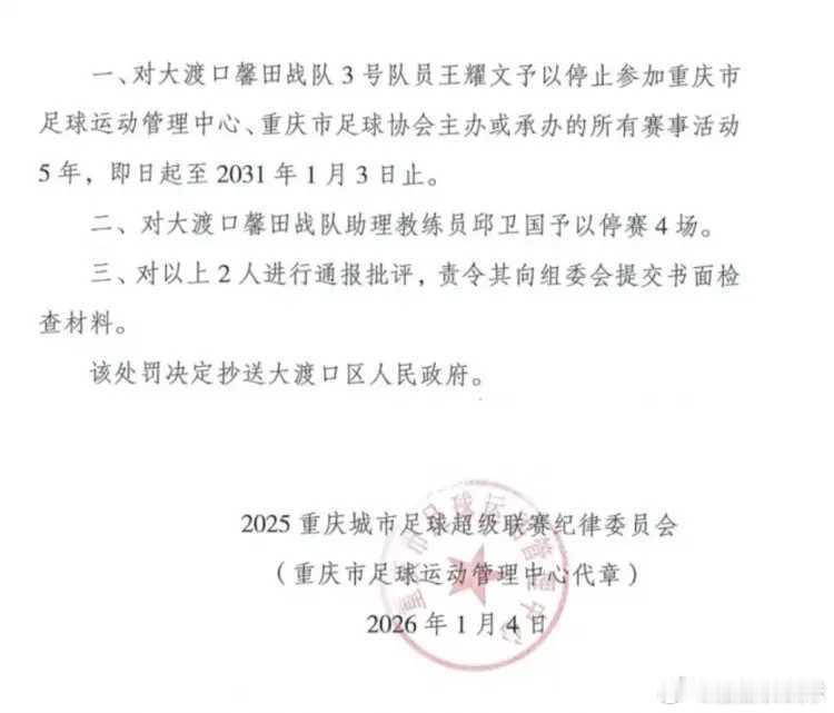 1月4日渝超官方对昨日在比赛冲突中存在严重违规行为的球员及教练进行了处罚。其中,有一名球员被禁赛5年。不过,其他球员都未遭到处罚,这引起了巨大的争议。