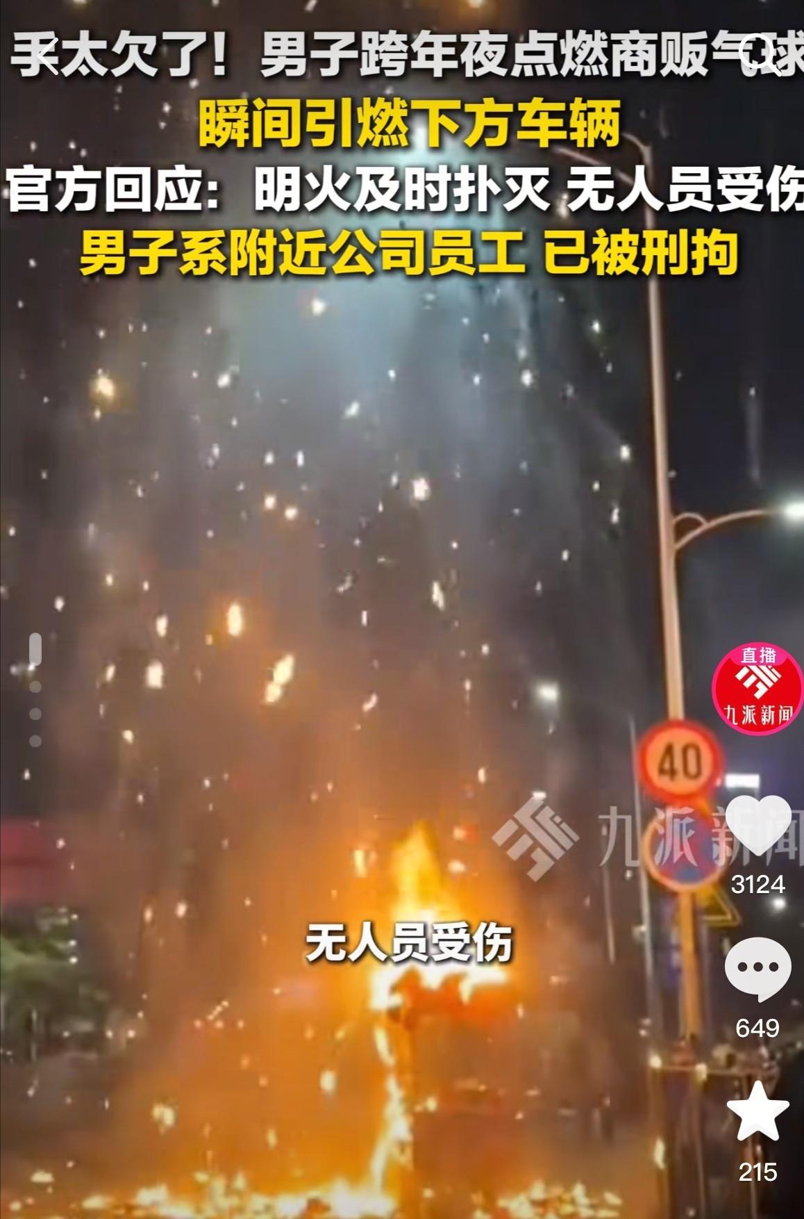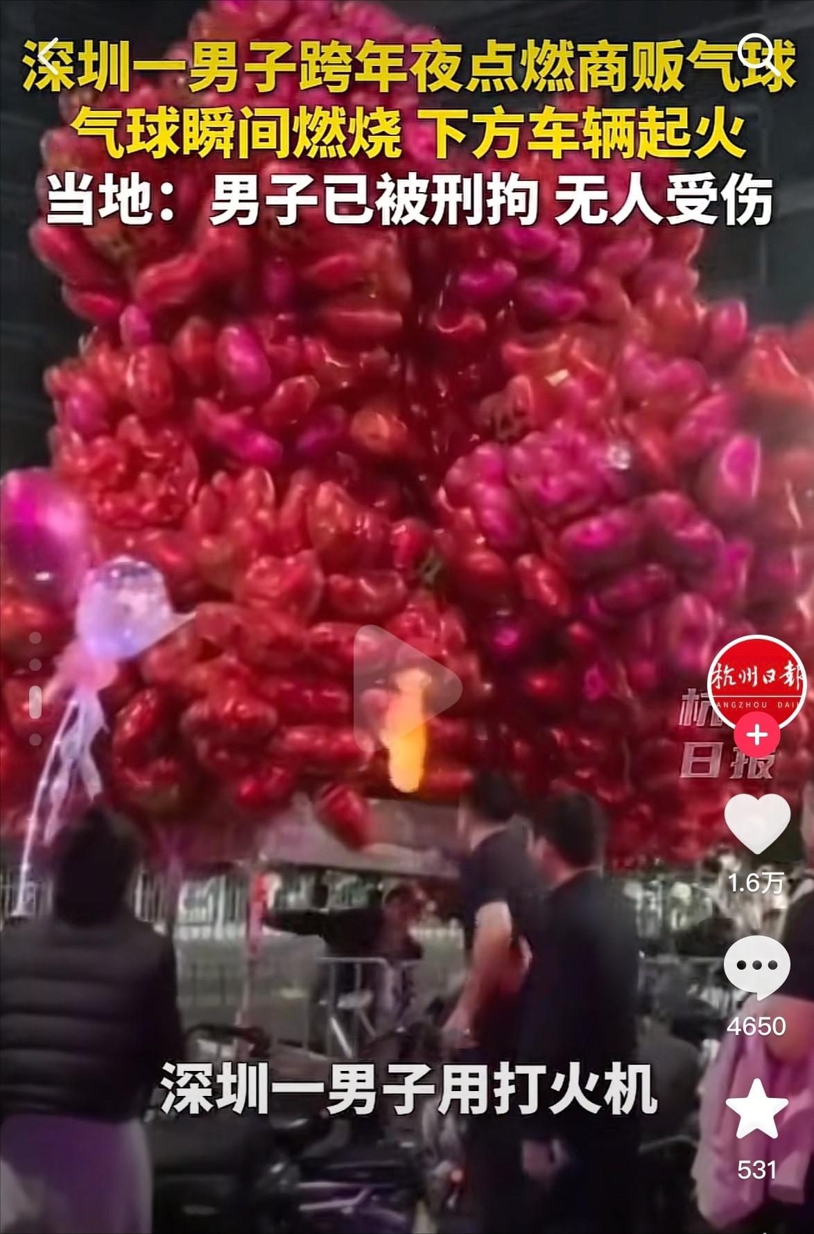 在跨年夜当天点燃气球的深圳男子现在是后悔莫及了!不光被刑事拘留了,工作估计也很难保住了。他的所作所为不单是酒后的愚蠢,而是纯纯的恶啊! 事情发生得很突然,前后也就几秒钟,快到旁边的人还没反应过来,火已经起来了。 那天是深夜,路上车不多,行人零零散散,卖气球的商贩推着一辆电动三轮车,在路边慢慢走着。 车上绑着一大把氢气球,颜色鲜艳,个头也大,在路灯下面一眼就能看到,他走得不快,一边推车一边留意路况,看起来就是普通收摊回家的样子。 点火的男子站在人行道内侧,前面有护栏隔着,位置很安全,他不是被挤到那里的,也不是被人推搡。 视频里能看到,他停下脚步后,身体稍微前倾,把右手从护栏上方伸出去,打火机凑近气球,随后就点着了,动作很明确,没有慌乱,也不像是失手碰到。 气球几乎是同时被引燃的,先是“轰”的一声闷响,接着火光猛地炸开,亮度一下子把周围照亮。 塑料气球受热迅速收缩、破裂,火星随着热浪往四周飞,三轮车的车篷、绳子很快被点着,商贩这才意识到出事了,下意识往后退。 现场有人开始喊,有人掏手机拍,还有人往后躲,好在这个位置离消防站很近,消防员几乎是第一时间赶到,把火扑灭,没有再扩大,如果再晚几分钟,电动车电池起火,或者旁边有别的车辆,后果很难说。 警方随后把点火的男子带走调查,确认身份后发现,他就在附近上班,当晚和朋友吃饭喝了酒。 但从现场情况看,他的行动是受控的:能站稳、能跨过护栏伸手、能准确点燃目标,这并不是意识模糊的状态。 这起事也不是因为纠纷,点火前,双方没有交流,没有对视,卖气球的人甚至都没注意到有人站在那里,一个在为生计赶路,一个站在路边消遣,两条轨迹原本没有任何交集。 火灭了之后,损失开始变得具体,气球基本全毁,三轮车多处被烧,电线、塑料件需要更换,对流动商贩来说,这不仅是几千块钱的问题,还意味着接下来一段时间没法出摊,收入直接中断。 而点火的男子,事情并没有随着火被扑灭而结束,刑事责任已经启动,工作也基本保不住。 对普通上班族来说,一旦留下这种记录,再想找工作会变得非常困难,很多单位在背调这一关就会直接拒绝。 赔偿同样绕不开,车辆、货物、直接损失,都会一笔一笔算清楚,这些钱不会因为一句“当时喝了酒”就消失。 更现实的是周围人的态度变化,一起吃饭的朋友,原本只是普通聚会,结果却变成目睹他人违法的现场。 以后还愿不愿意来往,心里都会有顾虑,谁也不想和一个情绪失控、行为不可预测的人走得太近。 至于卖气球的商贩,那天本来只是出来多卖点东西,补贴家用,天气冷,节日临近,他放弃了休息时间,却突然遇到这样的事,受惊不说,生计也受到了影响。 这件事让人难以接受的地方,不在于损失有多大,而在于它完全没有必要发生,没有矛盾,没有冲突,只是一个人的冲动,把危险带给了无辜的人。 很多人事后说“就点了一下”“没想到会这么严重”,但这些话对已经发生的后果没有任何意义,火这种东西,本来就没有试错空间,那一瞬间的行为,已经决定了之后一连串的代价。 信息源:广州日报、九派新闻