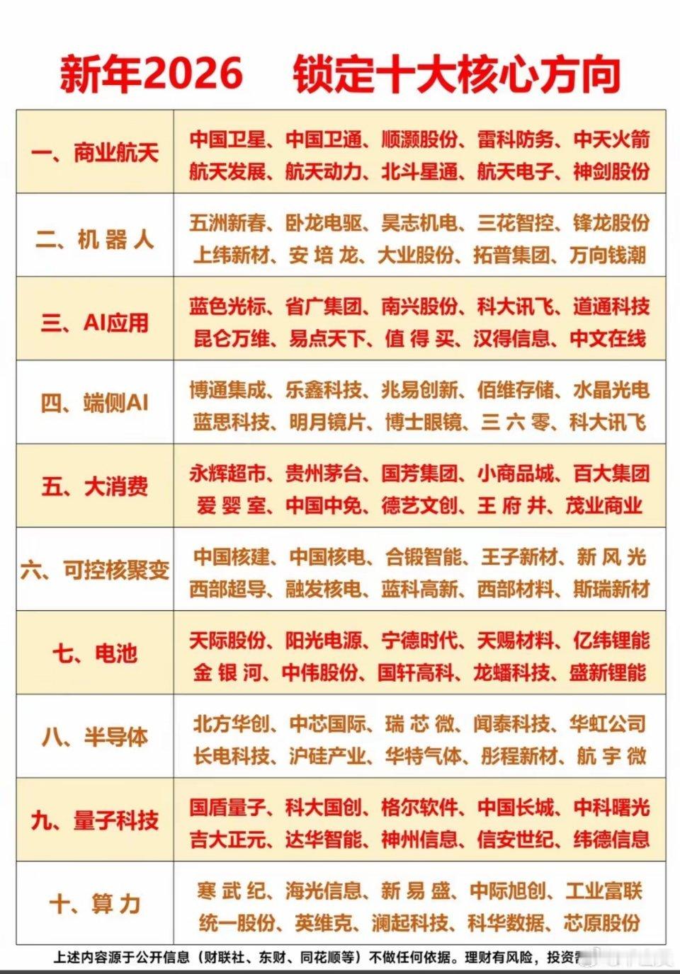 2026十大核心赛道谁是黄金风口?企业布局暗藏哪些机遇?2026年开年,商业航天、机器人、AI应用等十大核心赛道成为市场关注焦点,这份涵盖前沿科技与民生消费的赛道清单,不仅勾勒出全年产业发展的脉络,更让背后的布局企业站在了时代风口。在产业升级与科技革命的双重驱动下,这十大赛道真能成为2026年的财富密码?不同赛道的企业又该如何抓住机遇实现突围?十大赛道的划分,精准踩中了科技突破与消费升级的双主线。前沿科技领域,商业航天、可控核聚变、量子科技等赛道展现出硬核实力:商业航天集结了中国卫星、北斗星通等企业,从卫星制造到导航应用形成完整生态;可控核聚变汇聚中国核建、西部超导等龙头,在“终极能源”的攻坚中持续突破;量子科技则有国盾量子、科大国创等企业深耕,推动量子通信与计算的产业化落地。AI相关的应用与端侧AI赛道更是百花齐放,蓝色光标、科大讯飞在AI应用端挖掘场景价值,博通集成、兆易创新则在端侧AI的硬件层筑牢技术根基。高端制造与实体产业赛道同样看点十足:机器人领域的五洲新春、卧龙电驱聚焦核心零部件与整机制造,推动工业与服务机器人的普及;半导体赛道的北方华创、中芯国际扛起国产替代大旗,从设备到制造全链条突破;电池赛道的宁德时代、亿纬锂能持续领跑新能源储能与动力电池领域,算力赛道的寒武纪、工业富联则为数字经济提供算力支撑。大消费赛道则锚定民生需求,永辉超市、贵州茅台、中国中免等企业覆盖零售、白酒、免税等多元场景,在消费复苏的背景下释放稳健增长潜力。从前沿科技到实体制造,再到民生消费,2026年十大核心赛道构建起产业发展的全景图。这些赛道并非孤立存在,AI、算力等底层技术更是为各领域赋能,形成“科技+产业”的融合生态。对于企业而言,找准赛道定位、深耕核心技术,才能在2026年的产业浪潮中站稳脚跟;对于市场来说,这些赛道的发展也将成为中国经济转型升级的重要引擎。