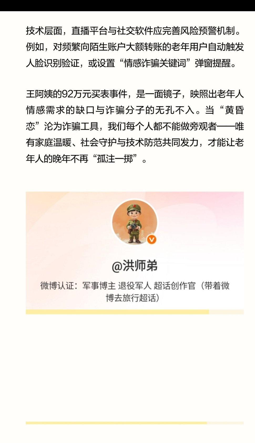 2026年元旦,上海浦东一家手表店内,68岁的王阿姨执意要花92万元购买一款名表,声称要“激活”男友充值的百万元账户。这场看似荒诞的闹剧背后,实则是一起精心设计的“杀猪盘”诈骗——骗子伪装成现役军人,通过短视频平台以温情攻势获取信任,最终诱导老人用养老钱购买奢侈品。 从“现役军官”的虚假身份到“系统故障”的诈骗话术,骗子精准抓住了老年人对陪伴的渴望。他们通过每日嘘寒问暖、伪造军装照片、编造部队生活细节,构建起一个“完美恋人”的形象。这种情感操控的可怕之处在于,它让受害者从被动接受到主动投入,甚至在民警劝阻时仍坚信“我们是有感情的”。正如上海静安区法院曾判决的类似案件中,一名70岁老人为“干儿子”主播打赏46万元,直言“他从小没妈妈,我就当做善事”——情感需求被利用,已成为诈骗分子的“突破口”。 从92万元名表到10万元直播打赏,老年人的养老钱正成为诈骗产业链的“重点目标”。骗子不仅伪造军官证、军装照片,甚至使用AI换脸技术制作部队日常视频,以增强可信度。他们以“内部投资”“账户激活”等名义,诱导老人进行大额转账或实物购买。更值得警惕的是,这类诈骗已形成“情感铺垫—小额试探—大额收割”的完整链条。王阿姨的案例中,骗子先以“100万元充值”降低其警惕,再以“8万元差价”作为诱饵,最终骗取92万元——这种“放长线钓大鱼”的策略,让许多老人防不胜防。 王阿姨的幸运在于店员的警觉与民警的耐心劝阻,但并非所有老人都能如此。要遏制此类诈骗,需构建三重防线: 家庭层面,子女应加强与父母的沟通,关注其情感状态与资金动向。例如,河南郑州的李先生为女主播打赏10万元后被拉黑,若家人能早些介入,或许可避免损失。 社会层面,社区与警方需加大反诈宣传力度,尤其针对独居老人开展“一对一”帮扶。上海浦东警方在元旦期间通过类似案例剖析话术漏洞,成功劝阻王阿姨,这种“以案说法”的方式值得推广。 技术层面,直播平台与社交软件应完善风险预警机制。例如,对频繁向陌生账户大额转账的老年用户自动触发人脸识别验证,或设置“情感诈骗关键词”弹窗提醒。 王阿姨的92万元买表事件,是一面镜子,映照出老年人情感需求的缺口与诈骗分子的无孔不入。当“黄昏恋”沦为诈骗工具,我们每个人都不能做旁观者——唯有家庭温暖、社会守护与技术防范共同发力,才能让老年人的晚年不再“孤注一掷”。