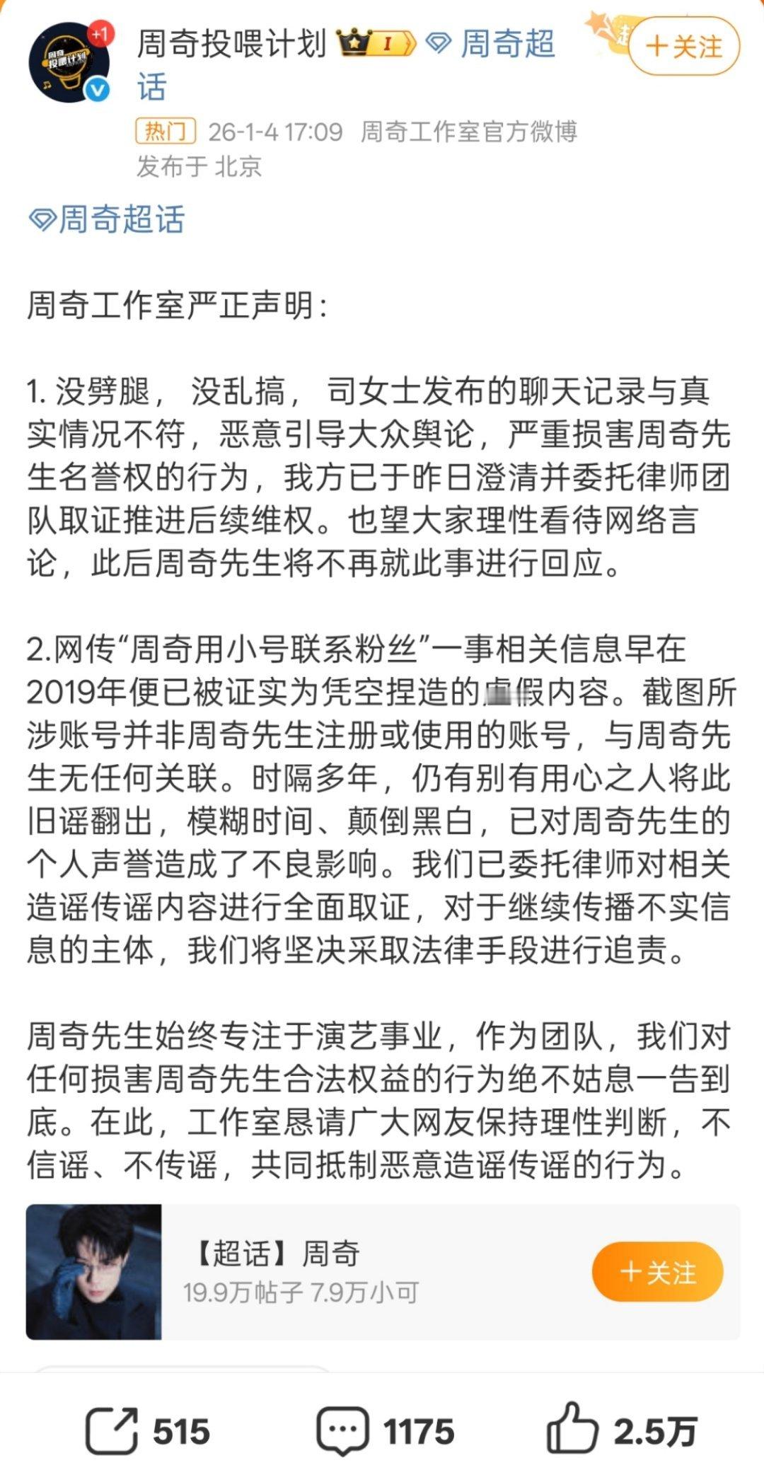 周奇工作室 没劈腿没乱搞针对近期争议,周奇工作室重磅回应:无劈腿无乱搞,不实爆料已委托律师取证,艺人专注演艺,对损害名誉行为绝不姑息。