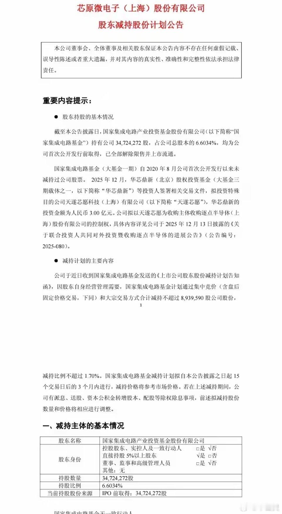 重磅信号!国家大基金减持9家半导体公司,后市怎么看?国家集成电路产业投资基金的动向,向来是半导体板块的“风向标”。2025年行业复苏与竞争加剧并存之际,大基金出手减持9家半导体公司,这一动作引发市场高度关注。这9家被减持企业,覆盖半导体产业链多个关键环节,业绩表现更是冷暖不一:- 芯原股份(AI ASIC龙头):市值720亿元,2025上半年营收9.74亿元(+4.49%),净亏损3.2亿元(同比扩大12.3%),大基金已实施减持。- 拓荆科技(薄膜沉积设备龙头):市值928亿元,上半年营收19.54亿元(大增54.25%),净利润0.94亿元,二季度单季盈利2.41亿元同比翻倍,依然被大基金减持。- 赛微电子(MEMS芯片核心标的):市值410亿元,上半年营收5.70亿元(微增3.40%),净亏损收窄至65万元,2025年已被大基金三次减持。- 燕东微(IDM模式代表):市值413亿元,上半年营收6.59亿元(+6.85%),净利润1.28亿元实现扭亏,不仅被三次减持,更有新减持计划落地。- 安路科技(FPGA芯片企业):市值109亿元,上半年营收2.23亿元(-29.64%),净亏损1.42亿元(扩大16.57%),遭遇两次减持。- 华大九天(EDA软件龙头):市值580亿元,上半年营收5.015亿元(+13.01%),净利润306.8万元(暴跌91.9%),被大基金减持。- 通富微电(封测龙头):市值572亿元,上半年营收130.4亿元(+17.67%),净利润4.121亿元(+27.72%),在业绩增长中被减持。- 泰凌微(物联网无线连接芯片):市值102亿元,上半年营收5.035亿元(+37.72%),净利润1.011亿元(暴增274.58%),被两次减持且发布新减持计划。- 德邦科技(电子封装材料):市值69亿元,上半年营收6.899亿元(+49.02%),净利润4557万元(+35.19%),同样被两次减持。值得注意的是,此次被减持企业中,既有业绩承压的亏损标的,也不乏营收利润双增的优质企业。大基金的操作,或并非单纯看空个股,更可能是基于产业周期调整、引导资金流向更具潜力的细分领域的布局。对普通投资者而言,需警惕减持带来的短期情绪冲击,但更要结合企业核心技术壁垒、业绩增长韧性以及行业政策导向综合判断,切勿盲目跟风操作。