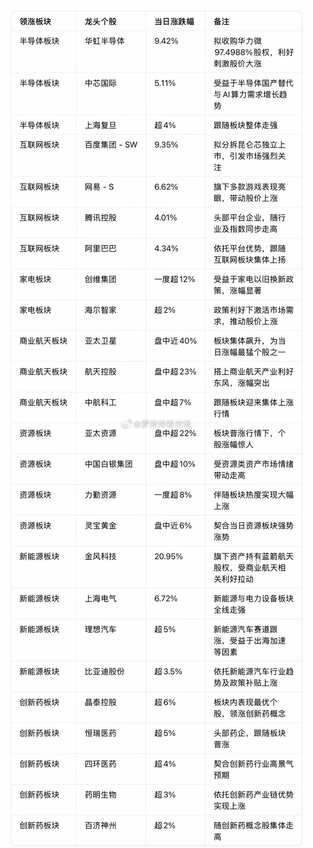 港股2026开门红哪家强多个板块强势领涨,其中科技相关板块尤为突出,同时家电、汽车、资源、商业航天等板块也有亮眼表现:1. 半导体板块:堪称当日最耀眼的领涨板块,华虹半导体涨9.89%,其此前抛出重组方案将大幅提升产能与技术实力;中芯国际涨超5%,上海复旦涨超4%,板块上涨得益于企业重组利好与半导体国产替代、AI算力需求增长的产业趋势支撑。2. 互联网板块:受AI业务利好推动集体走高,百度集团 - SW涨近10%,因拟分拆昆仑芯独立上市;网易 - S涨6.62%,旗下多款游戏表现亮眼;腾讯控股涨4.01%、阿里巴巴涨4.34%,头部平台企业的上涨有力拉动了板块及恒生科技指数走高。3. 家电板块:政策利好下涨幅显著,创维集团一度涨超12%,海尔智家涨超2%。此前发改委等部门印发以旧换新政策,对冰箱、电视等多类家电的补贴政策激活了市场需求与资本市场情绪。4. 商业航天板块:当日迎来集体飙升,亚太卫星盘中涨近40%,航天控股盘中涨超23%,中航科工盘中涨超7%,成为当日盘面中极具爆发力的板块之一。5. 资源板块:个股涨幅惊人,亚太资源盘中涨超22%,中国白银集团盘中涨超10%,力勤资源一度涨超8%,灵宝黄金盘中涨近6%,板块整体的强势表现为市场增添了不少热度。6. 新能源板块:新能源与电力设备板块全线走强,金风科技暴涨20.95%,上海电气上涨6.72%,哈尔滨电气等多只个股涨幅超5%;新能源汽车领域,理想汽车涨超5%,比亚迪股份涨超3.5%,政策补贴与出海加速等因素推动板块走高。7. 创新药板块:同步市场迎来普涨行情,成为开门红中的重要助力。板块层面,港股创新药(931787)指数当日上涨1.97%,收于1280.61点,成交额达28.71亿,量价配合稳健。个股中,晶泰控股表现最为亮眼,盘中一度涨超8%,收盘涨超6%;恒瑞医药涨超5%,四环医药涨超4%,药明生物、信达生物涨超3%,百济神州涨超2%,头部及细分领域龙头均有积极表现。上涨核心逻辑源于行业高景气预期:政策端对真创新的支持、商保与集采优化构建良性支付环境,叠加2025年BD交易爆发式增长奠定的产业基础,市场对2026年创新药“价值兑现”周期充满信心。主要板块龙头个股当日表现列表附后,喜欢的收藏研究。你觉得A股会跟吗?开盘即知!不追高!
