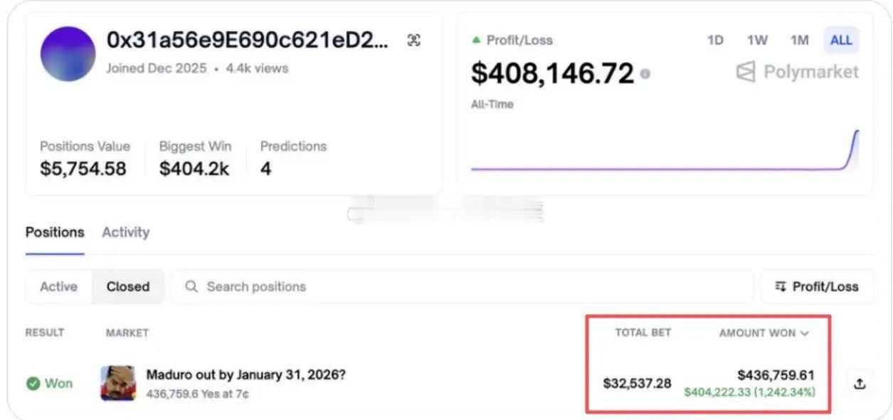 马杜罗被抓后的第一个受益者出现了,投了3万多美元赌马杜罗下台,一天后便赚了40万美元,投资回报率超过1200%!美国有一个全球知名的预测市场平台,叫polymarket,可以在上面做各类事件结果的预测投资。比如,美联储是否降息、美国总统的选举结果等。最近,马杜罗何时下台登陆该预测平台,投资者可以进行下注,鉴于美军很早就把军舰开到委内瑞拉海域但一直没有行动,到周五晚上赌马杜罗在2026年1月31日前下台的合约价格只有5-7美分。而就在美军发动对委奇袭的前一天,一个刚在平台注册不到一周的新账号突然斥巨资下注“马杜罗下台”,总共投了3.25万美元。原以为这位投资者将损失殆尽,没想到在下注的一天后美国三角洲部队便把马杜罗和他妻子带离了委内瑞拉,这意味着马杜罗真下台了。靠着这次豪赌,这位投资者在不到24小时内让投出去的3.25万美元变成了43.38万美元,净赚40.42万美元,回报率高达1242%,而且只用了一天就赚了超过12倍的收益。问题来了,这人是运气特别好还是眼光独到呢?我觉得都不是,合理的解释是此人可能有内幕消息,弄不好是五角大楼的工作人员,或者美军某位高级将领的亲朋好友。他不一定知晓“抓马”行动的具体时间,但可能知晓得到了美军很快要行动的消息,于是在polymarket上下了重注赌1月底前“马杜罗下台”。为了掩人耳目还特意注册了一个新的账号。polymarket并非传统的金融投资平台,理论上甚至不对美国用户开放,处于监管灰色地带,靠内幕消息预测赚钱并非不可能。更让人细思极恐的是,下注者会不会是马杜罗身边的人或亲友。考虑到美军之所以能找到马杜罗并且兵不血刃地实施抓捕,要归功于美国情报部门对委内瑞拉的渗透和对相关人员的收买,保不准真是如此。