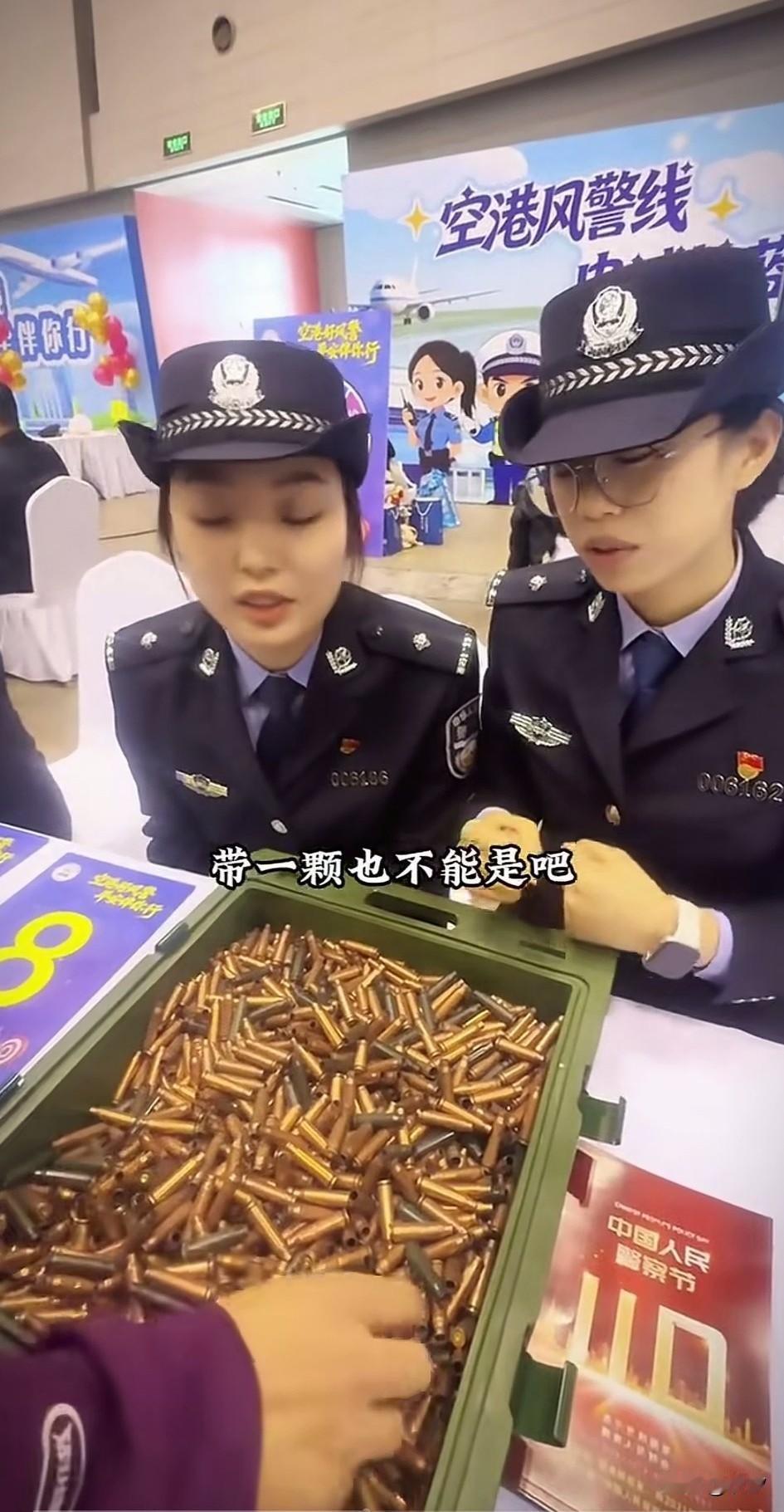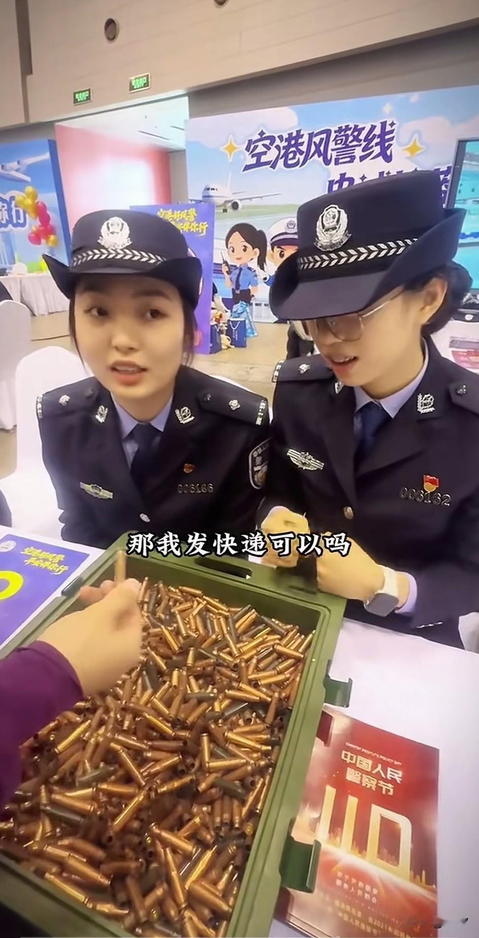 警察节活动现场, 一名博主对着两位警察小姐姐提出了询问,他的眼前是一盒弹壳, 他就问警察小姐姐带这个可以坐火车吗?,警察小姐姐说不行, 然后他又问可以坐高铁吗? 然后警察小姐姐依旧说不行, 不死心了的他又问了问能坐飞机吗? 正常小姐姐都被他问愣了, 犹豫了2秒还是告诉他不可以, 随后他又问可以寄快递, 小姐姐依旧告诉他不可以, 这位博主只能无奈的拿起了一颗弹壳做纪念,很多网友表示都不能带那我怎么做纪念?还有网友表示有些坏人会将蛋壳重新利用,这就是限制流动的原因! 这个视频获得了很高的点赞量, 这样宣传挺受欢迎的, 至少对于很多年轻人非常有用, 因为毕竟很多年轻人喜欢收集弹壳, 然后做成特别漂亮的摆件, 大家对于弹壳不能携带清楚了吗? 警察节 节日警察 警察纪念品 三八警察 弹壳巡游 玩具弹壳