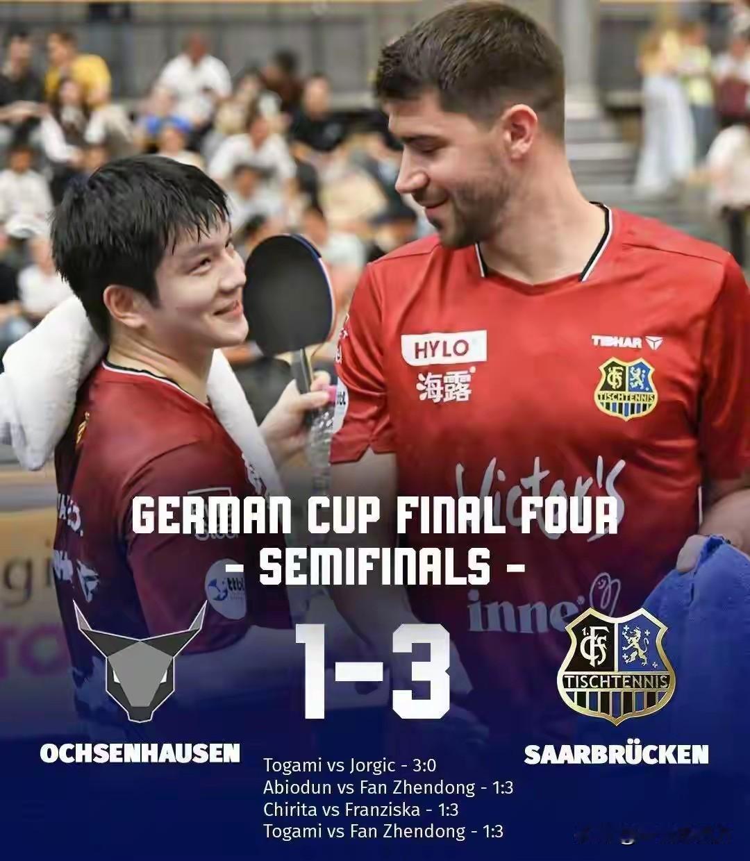德国杯乒乓球决赛,樊振东效力的萨尔布吕肯对阵富尔达马伯策尔,这也是去年德国杯决赛的重演,当时,没有樊振东的萨尔布吕肯输给对手,屈居亚军。这次有了樊振东坐镇就完全不同了,他在第一盘和第四盘先后击败奥恰洛夫和菲卢斯,虽然弗兰西斯卡输球了,但达科3-0击败孟凡博,最终萨尔布吕肯3-1战胜对手,为去年的失利复仇,樊振东继半决赛后再次独得两分,6小时内连拿4场胜利,夺得留洋生涯首冠。