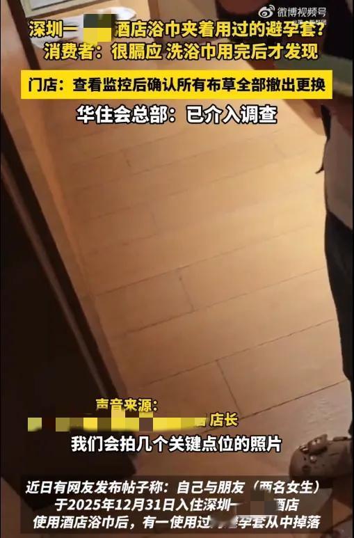 万万没想到!两个女生住在深圳某酒店,打开浴巾后里面居然掉出来一个用过的避孕套掉。 跨年夜,深圳两位女生入住某连锁酒店。本来应该是迎接新年的放松时刻,却被一件极其恶心的事打破。 洗漱时,她们打开酒店提供的浴巾,一个用过的避孕套从中掉了出来。你可以想象那个场景和心情,简直是瞬间头皮发麻。 事发后,她们立刻联系酒店。 店长到房间处理,给出的解释是:可能在更换浴巾时,没有打开查看。当时的处理方案是,免除了她们当天的房费。 但事情并没完,当晚,酒店方给她们发了一段文字,单方面告知:查看了监控,确认所有布草(床单、毛巾等)都已撤出更换,并且除了工作人员,没有其他人进过房间。 听起来像是个“最终调查结果”,对吗?可矛盾点来了。 顾客说,她们从未看到过任何监控视频。 而事后记者采访酒店,工作人员称“确实发生过这起事件,并且给该客人提供了相应的监控”。双方说法完全对不上。 目前,华住会总部已经表示介入调查。 现在住酒店啊,从进门开始心里就得打鼓:烧壶水先烫马桶圈,再看看床单有没有头发、浴巾干不干净,这都快成标准流程了。 我们付了房费,买的应该是舒心和安心,而不是一份需要自己来完成的安全检查! 如果是你遇到这种事情,心里会不会隔应?