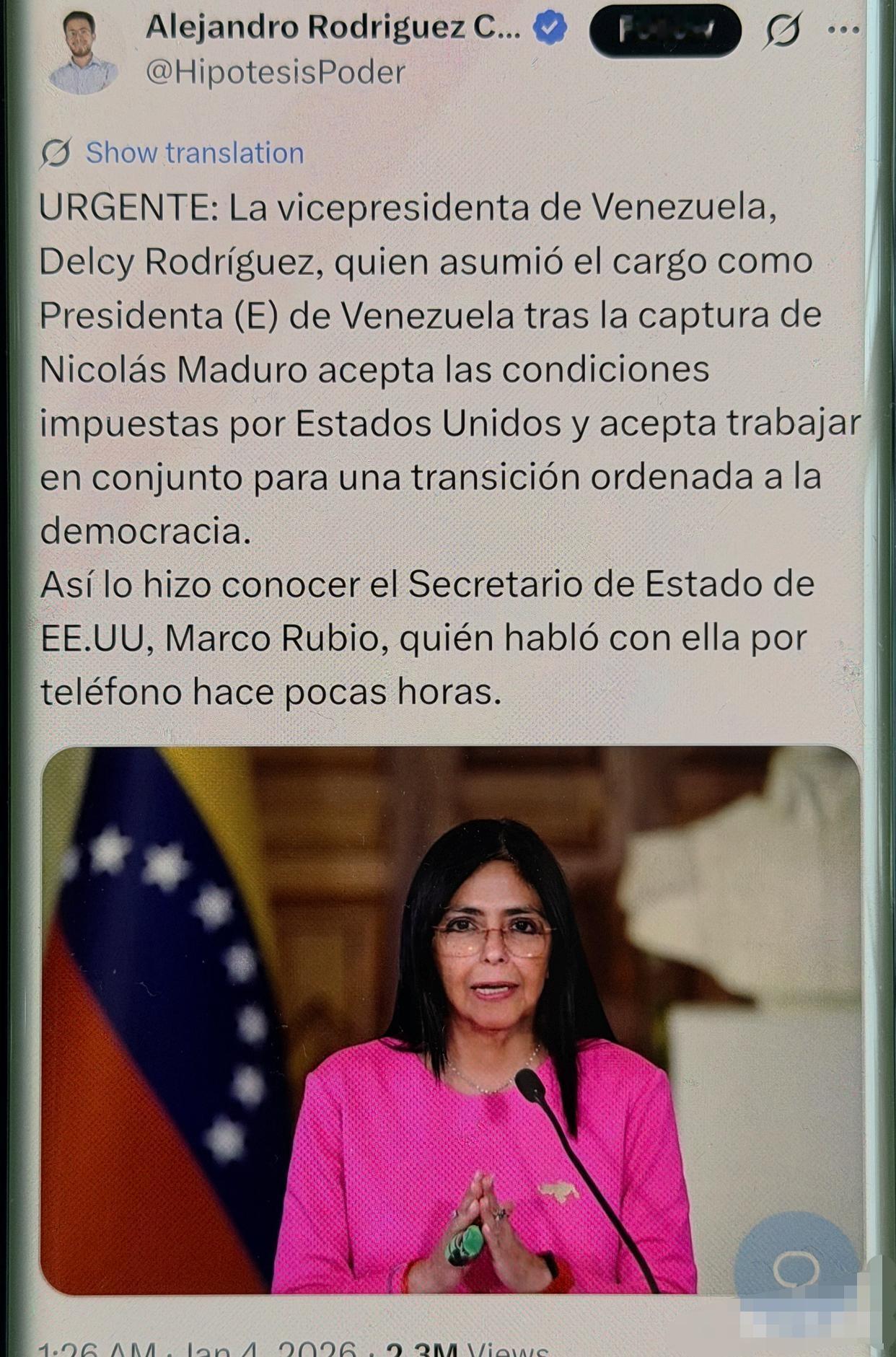 委内瑞拉副总统德尔西·罗德里格斯在尼古拉斯·马杜罗被捕后出任委内瑞拉代理总统,其已接受美国提出的条件,并同意共同推动向民主制度的有序过渡。 马杜罗被美军抓获以后,委内瑞拉副总统罗德里格斯已经代行总统职权,由此可见,马杜罗再次回到总统职位的概率几乎为零,而这位代行总统罗德里格斯曾经也是马杜罗最信任的人之一。 美国国务卿马尔科·鲁比奥于数小时前与德尔西·罗德里格斯通电话,并公布了这一消息。 ​马杜罗大概率要被纽约法庭宣判有罪,马杜罗就回不去委内瑞拉了。剧本可能就是马杜罗被判有罪,委内瑞拉副总统半推半就,接任总统,并将一部分石油利益让给美国公司,从而实现平稳过渡。