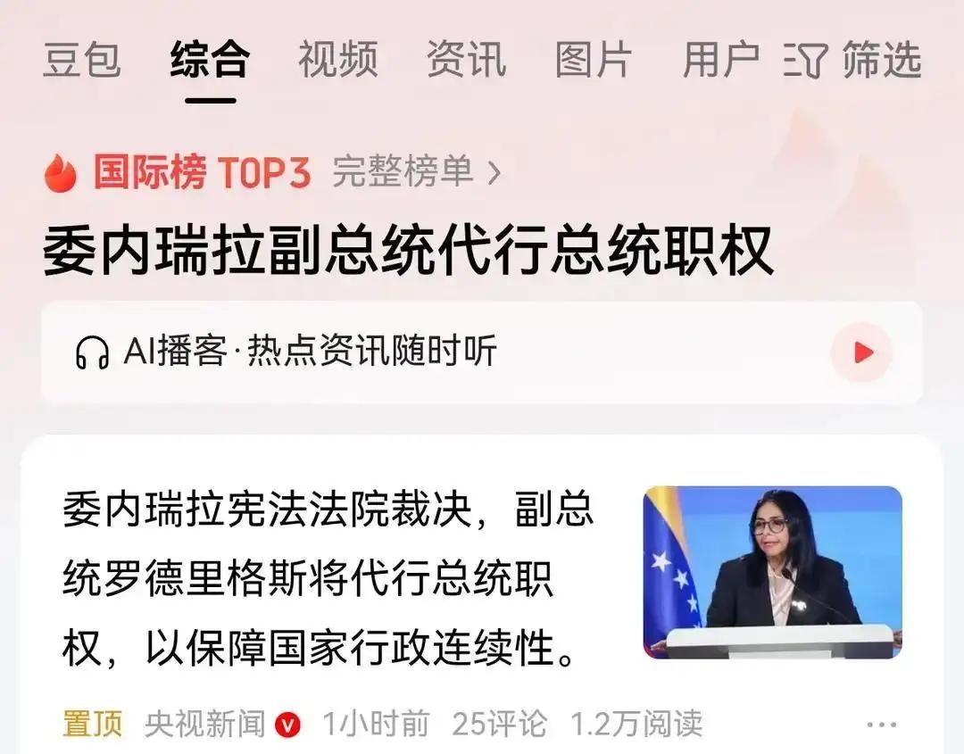 委内瑞拉副总统德尔西·罗德里格斯在尼古拉斯·马杜罗被捕后出任委内瑞拉代理总统,其