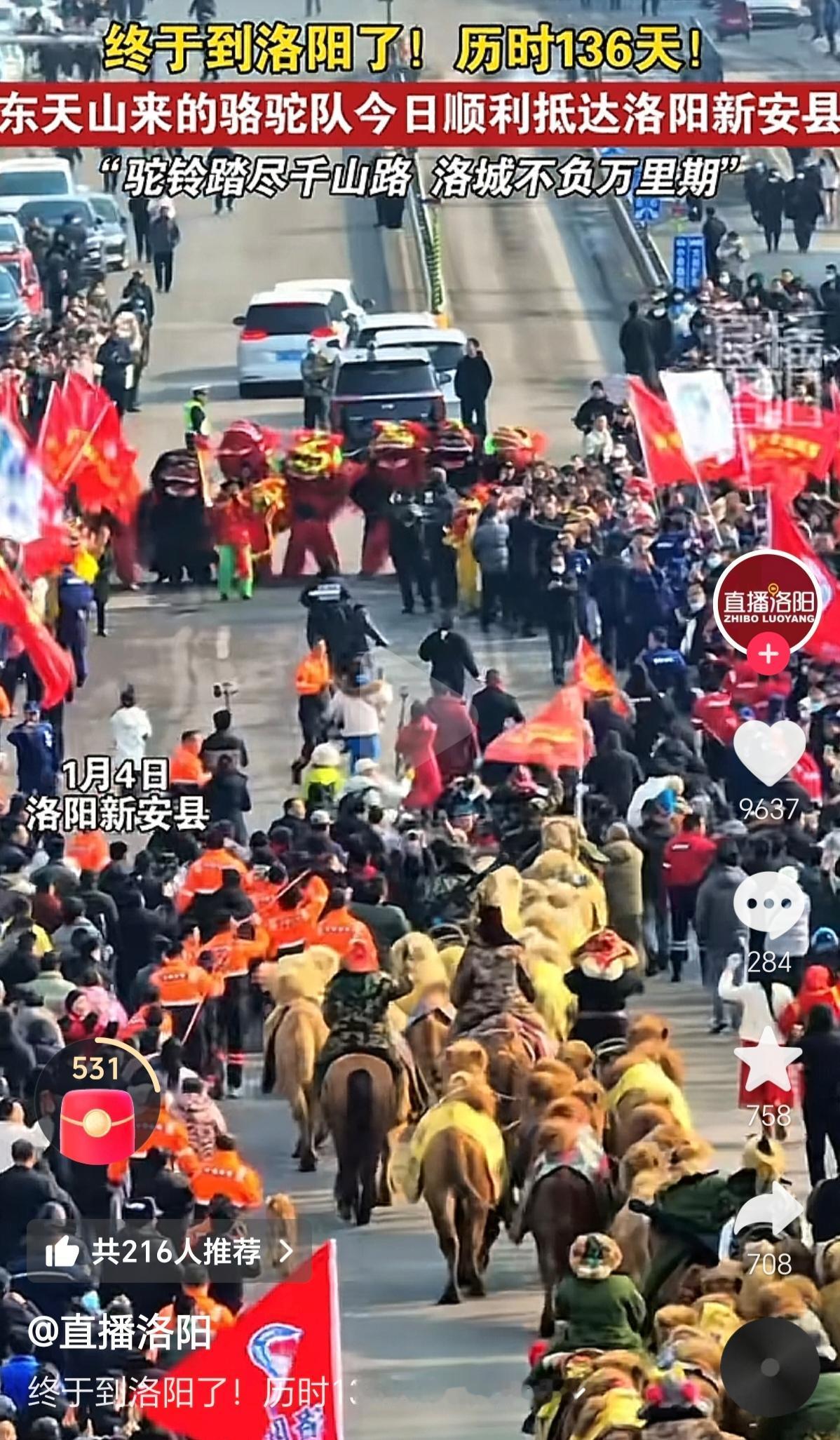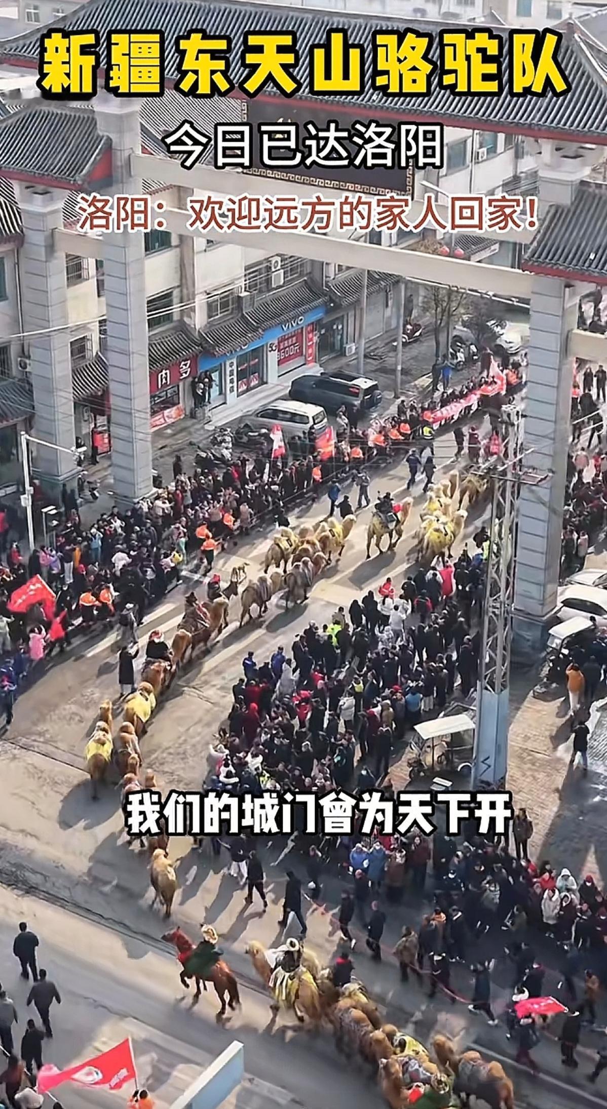 1月4日,我国新疆东天山骆驼队,历时136天,历经3000余公里,顺利抵达洛阳新安县。这是两地文旅的一次宣传推广项目,东天山骆驼队重走丝绸之路,来到洛阳,仿佛重现了两千多年前的丝路场景。驼铃踏尽千山路,洛城不负万里期。