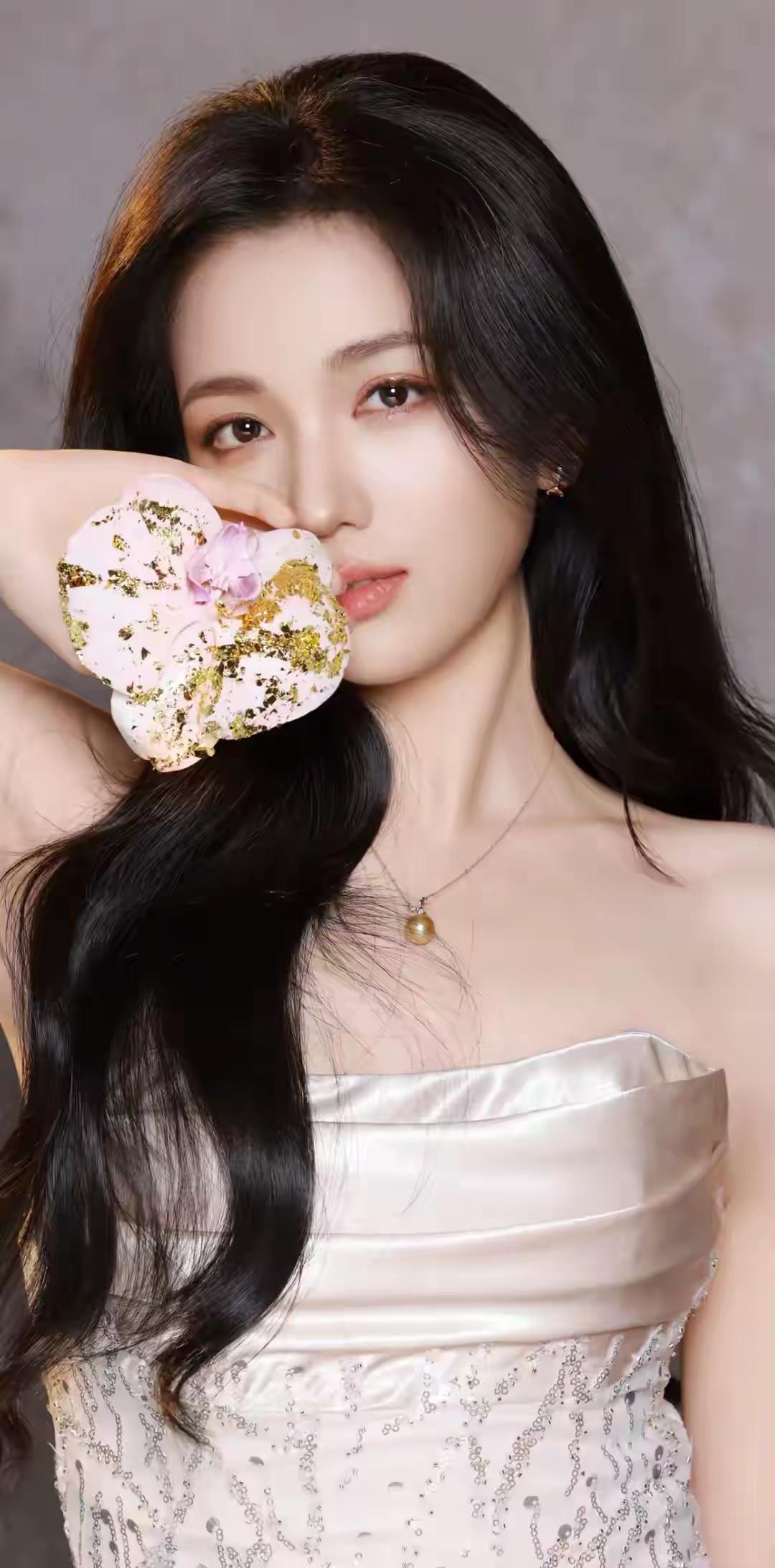 优雅黑发美人,珍珠项链与银色礼服相得益彰,尽显高贵气质。