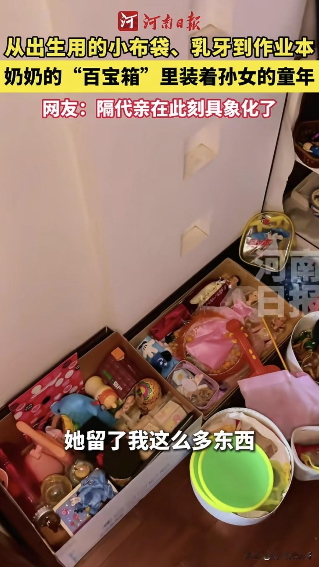 看看隔辈亲有多逆天,湖南一女子清理房间,发现奶奶把她从小到大的所有物件都完好的保留了下来。从脱落的乳牙,到作业本,从出生的小布袋,到日常的玩具,每一样都用盒子整整齐齐的放好,甚至连小时候剪下来的指甲都保留着,感动的她热泪盈眶。 用她的话说就是全网也找不出第二个奶奶有这么细心了。有人羡慕她奶奶没有重男轻女的思想,也有说她奶奶是一个细心的人,但这一切都归咎于奶奶对她深沉的爱,正是因为这份爱,才会有这样的“百宝箱”。
