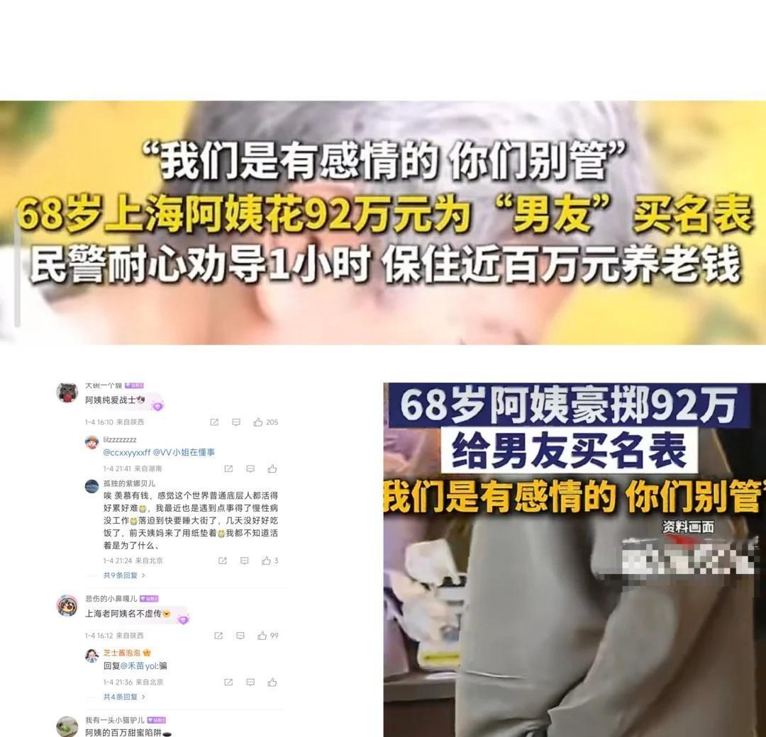 谁把老人推向了骗子的“温情陷阱”? 近日,上海浦东一家手表店的报警电话,揭开了一则令人揪心又庆幸的“诈骗未遂”事件——68岁的阿姨执意要花92万元购买名表,只为“激活”网恋男友口中的“百万元账户”。 店员警惕、民警耐心,最终在一小时劝说下揭穿骗局,保住了阿姨的养老钱。 事件中,阿姨那句“我们是有感情的,你们别管”令人心酸。它不是简单的固执,而是许多独居老年人在情感缺失与数字鸿沟交织下的真实缩影。 短视频平台里“现役军人”的温柔陷阱、虚构的“珠宝APP充值系统”、许诺的“8万元好处费”……诈骗剧本并不新鲜,却屡屡击中老年人对陪伴的渴望和对“低成本高回报”的轻信。 有人说:“老年人谈起恋爱,像老房子着火,救不了。”这话虽带调侃,却也折射出社会对老年情感需求的片面认知。 孤独并非年龄的特权,而对情感的向往更不应成为被诈骗的“原罪”。 与其调侃“老房子着火”,我们更该追问:为什么那么多老人宁愿相信屏幕那端的陌生人,也不愿向身边的亲人求助? 家庭沟通的缺失、社会支持系统的薄弱,是否无形中把老人推向了骗子的“温情陷阱”? 庆幸的是,这次事件有一个“闭环守护”:店员的警觉心、民警的劝导力、阿姨最后的醒悟,共同织成了一张及时的安全网。 如果其中任一环节失效,后果不堪设想。 这提醒我们: 1. 子女的关心要多一步:不仅要提供物质赡养,更要主动倾听父母的情感需求,普及新型诈骗案例; 2. 社会的防线要密一层:商场、银行、社区应加强针对老年人的反诈宣传和干预机制; 3. 平台的监管要紧一扣:短视频、社交APP需压实主体责任,打击利用“人设”进行情感诈骗的账号。 每一个差点得逞的骗局,都是社会温情的减分项;而每一次及时的拦截,都是人性善意的加分题。 希望这位阿姨的经历,能成为更多人的警示——爱无关年龄,但清醒是保护爱的铠甲。 社会 新闻 老年人上当受骗 上海 爷爷 奶奶 婆媳 社会新闻 和老人相处