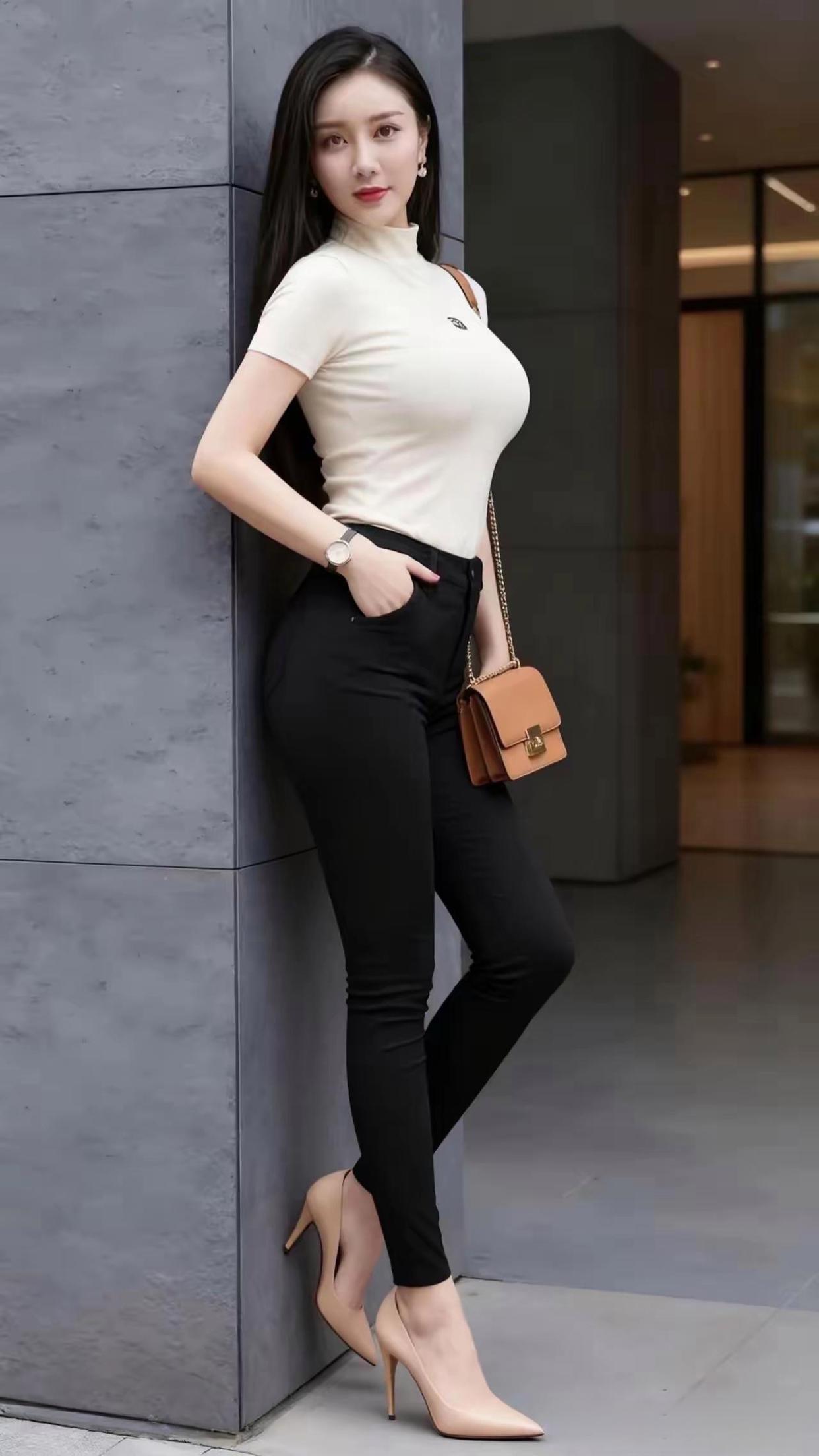 都市时尚穿搭指南:简约白T恤+黑色紧身裤,优雅高跟鞋,手提包点缀,自信满满!
