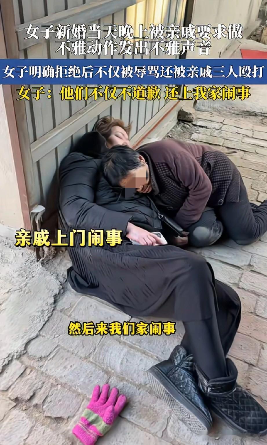 河北,女子说自己刚结婚,有件事还挺恶心人的。就是在她结婚当晚,有个男亲戚让她和丈夫做不雅动作,还要发出不雅的声音。当时她就很反感,明确的拒绝了这个亲戚的要求。 结果这个亲戚看到她拒绝后,一直骂骂咧咧,还和其他几个亲戚纠结在一起,为了显示自己的不满,还殴打了他们。 本来高高兴兴的喜事,被闹成这样。女子已经够窝火的了,但是都是亲戚,她也没过度埋怨。 可是女子这边还没怎样,打人的亲戚第二天却上门闹事了,躺在她家门口不肯走,仿佛他们受了天大的委屈。 我觉得这样的亲戚,根本就不算亲戚,以后没必要交往了。她们不是不走吗,直接打电话报警,让帽子叔叔解决。 我有个问题,有没有河北的朋友解释一下,河北的婚闹真的这么离谱吗? 对于这件事,你怎么看呢?