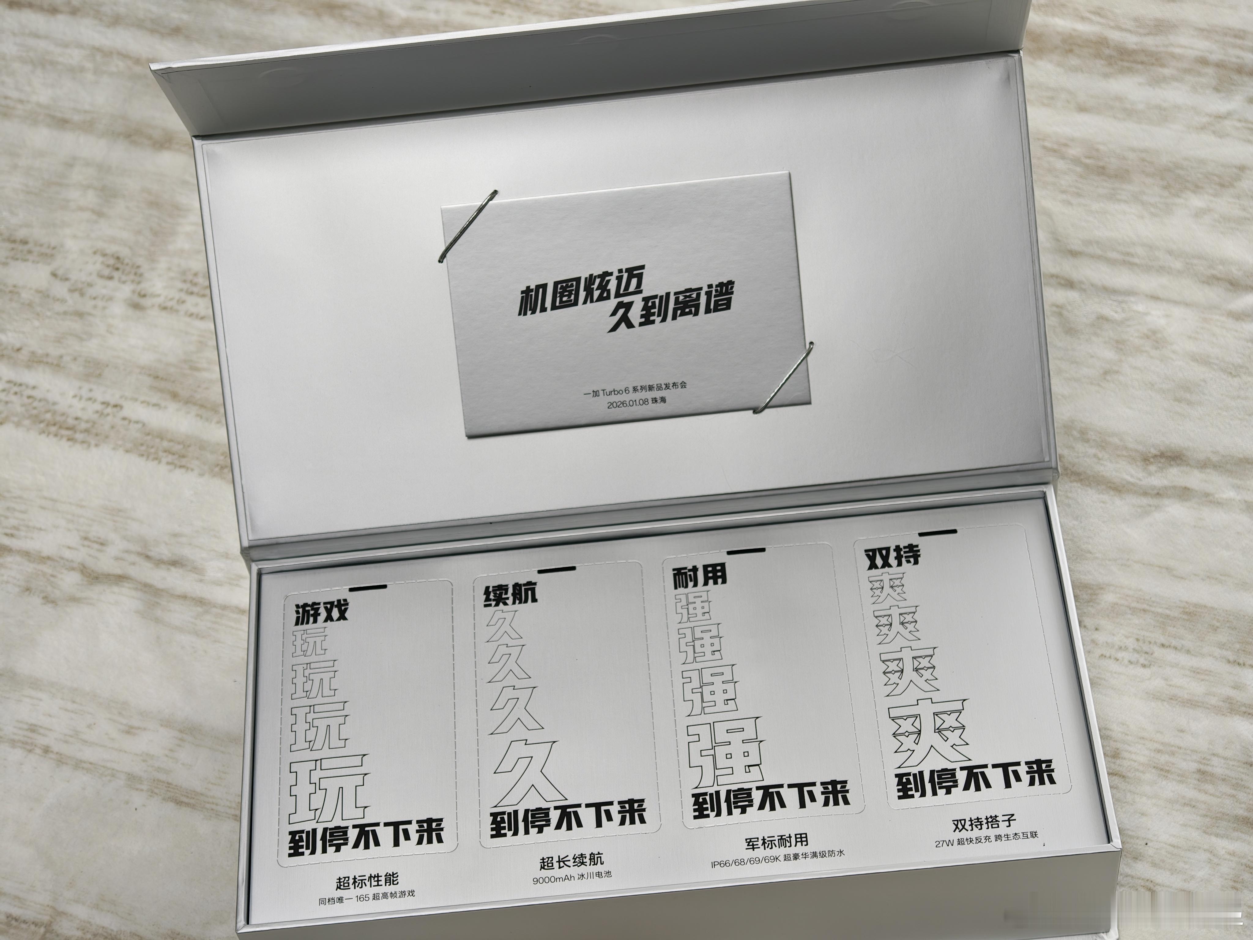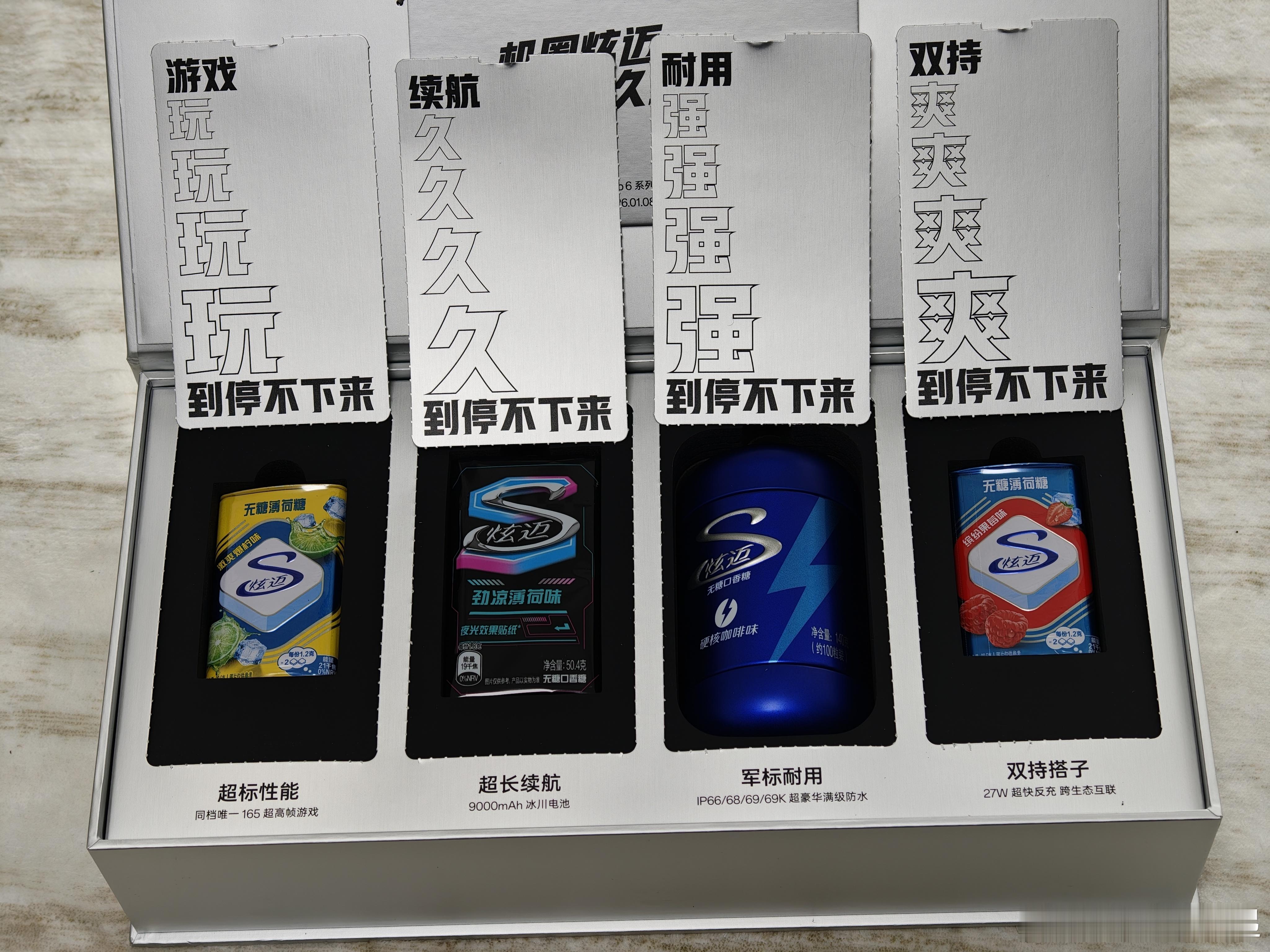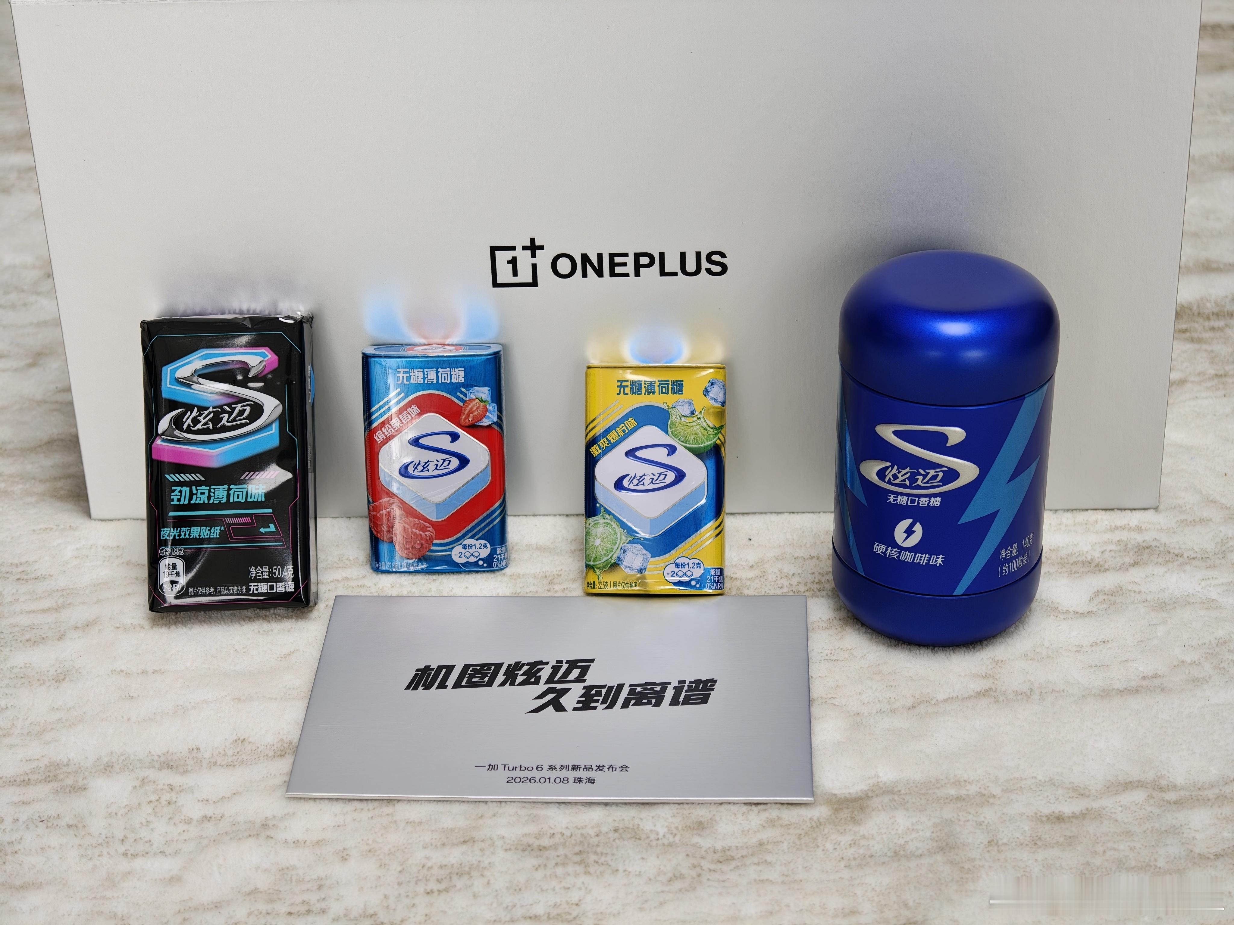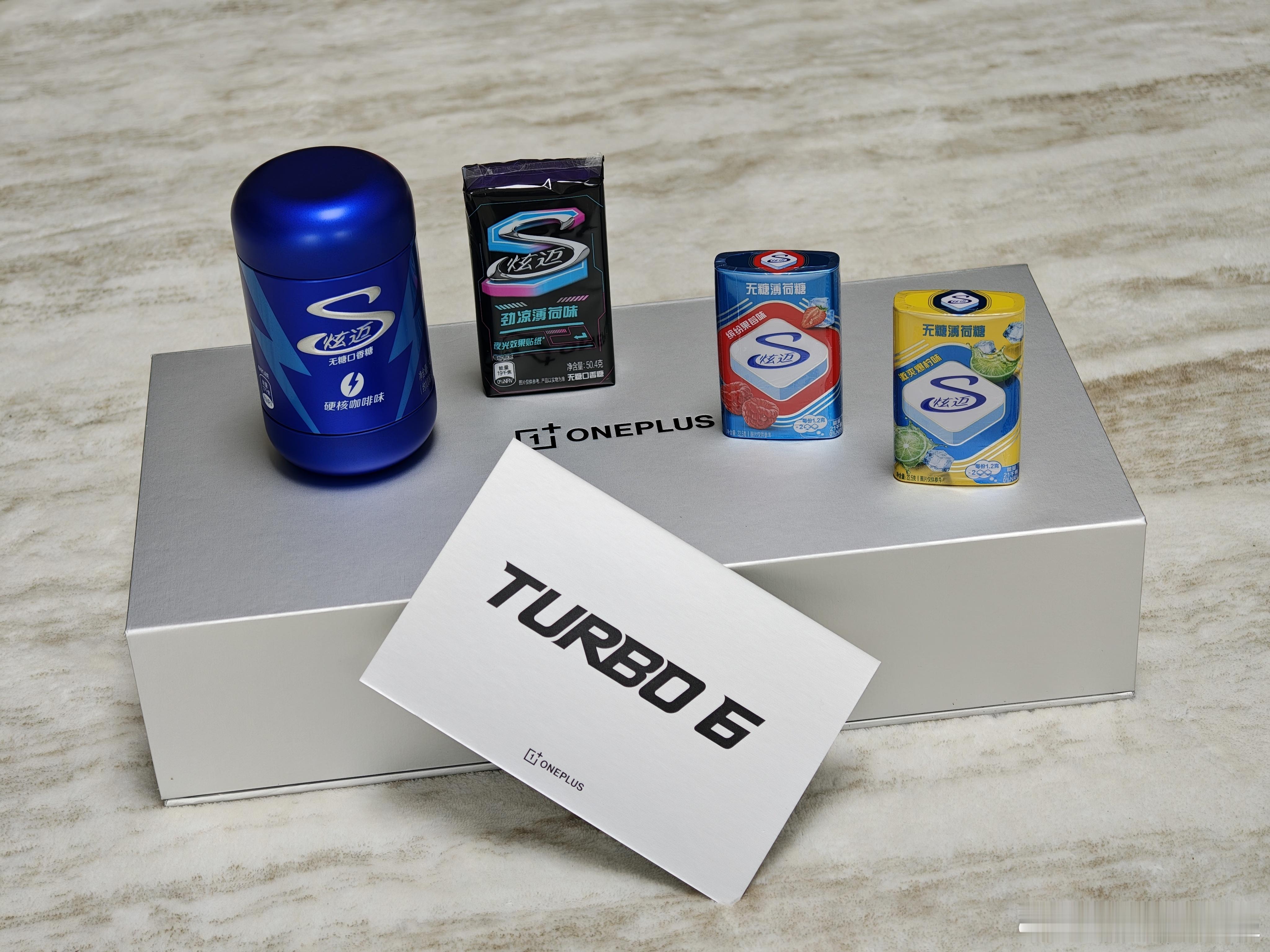机圈炫迈来了!一加Turbo6邀请函收到了,里面是各种风味的炫迈口香糖,美味停不下来。这次的联动主要还是因为双方共同的持久基因,一个美味持久,一个续航持久,9000mAh 超巨量冰川电池,满足你对续航的所有想象一加Turbo6机圈炫迈
