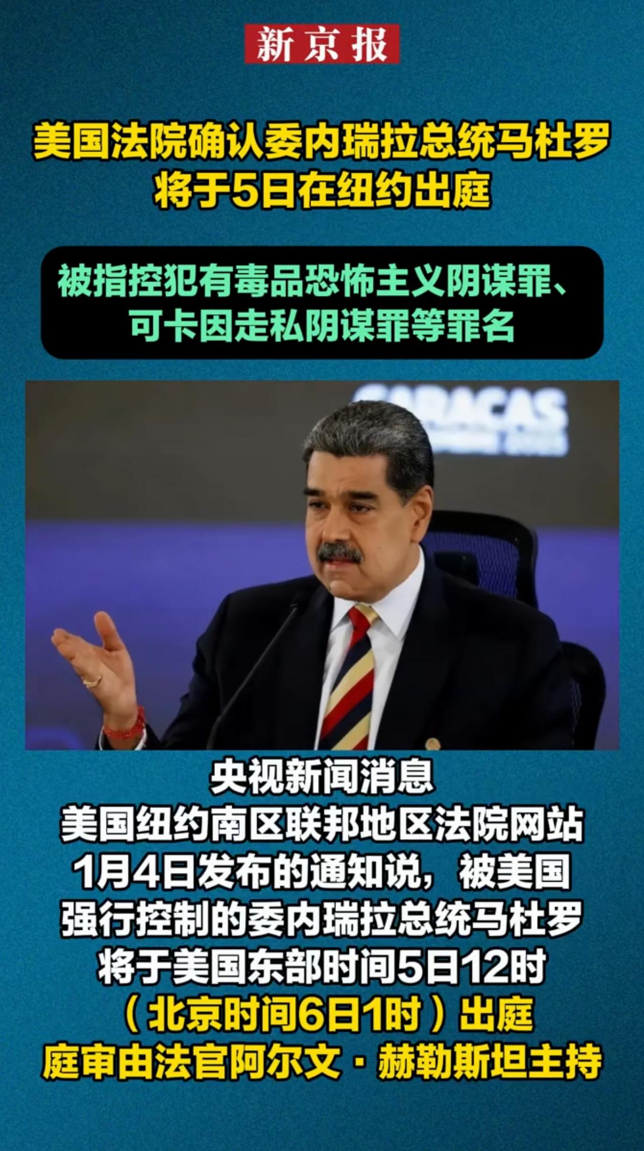 马杜罗将于5日在纽约出庭, 看看被美国指控的这些罪名, 马杜罗能不能坚持否认到底?和当年萨达姆一样,到最终的审判都没有屈服,嘴里还喊出最后不屈的口号,“真主是伟大的! 这个国家将赢得胜利”。 如果马杜罗在美国屈服,或者屈打成招了,委内瑞拉国内形势就难办了。。。 看马杜罗被抓后说“新年快乐”和举双拇指的视频和照片来看,估计。。。