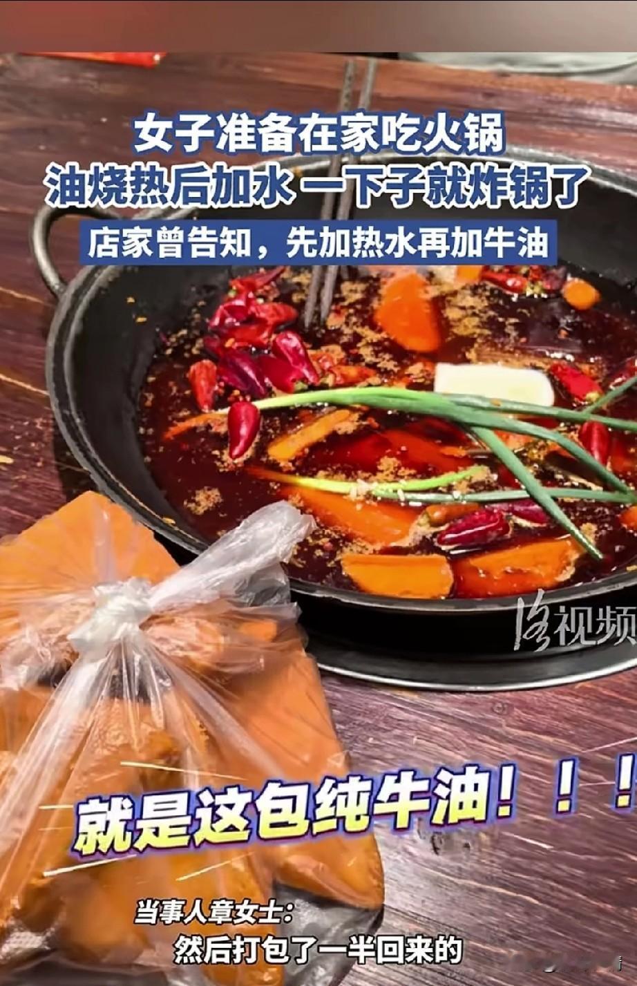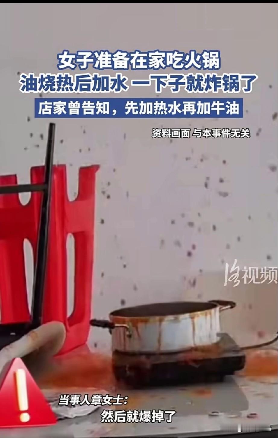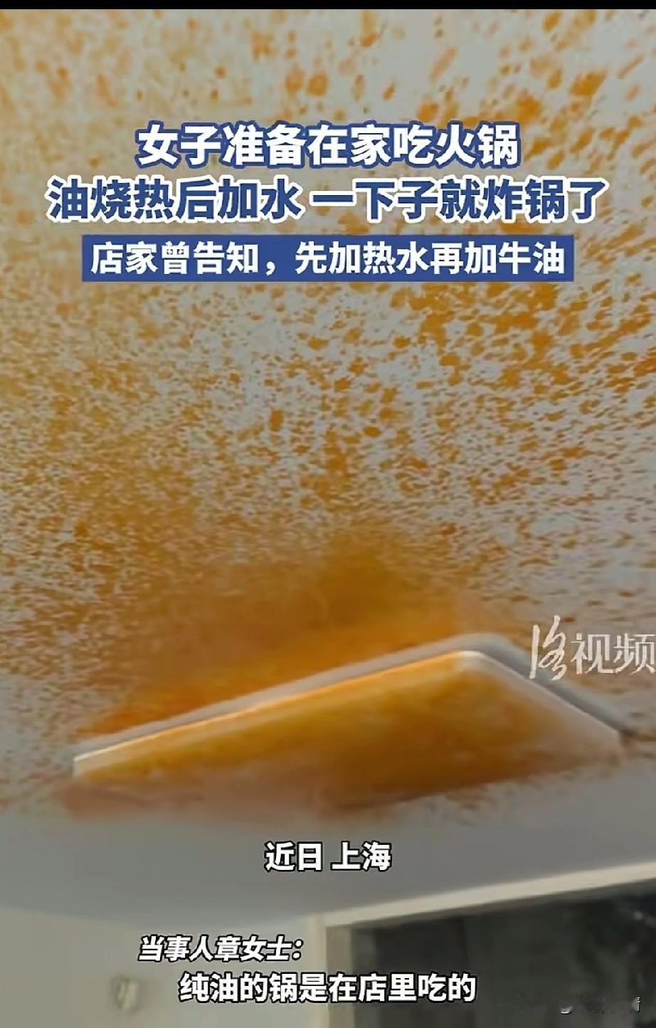 女子准备在家吃火锅, 于是就去店里面打包了锅底, 想着回来可以美美的吃一顿, 临走的时候店家也告诉她, 先加水再加牛油锅底, 结果她却当成了耳旁风, 回到家中之后就用电锅开始将牛油融化,直到牛油沸腾之后, 她才想起来加水, 桌子上满满都是她爱吃的菜, 可就在她加水的那一瞬间, 砰的一声炸了, 牛油直接溅的房屋到处都是, 屋顶的灯上以及天花板都成了牛油, 吃顿火锅直接让房屋需要重新装修, 这可让你女子炸了锅, 这时候才想起来店家的提醒, 先加水,再加牛油, 她万万没想到自己反过来操作后, 居然会发生这样的事情, 这么大的损失,还不如在店里吃, 油在沸腾的时候加水肯定会到处乱蹦, 这点常识都不知道, 看来不是资深吃货呀, 肯定是在家也不会做饭, 天天点外卖那种, 如今想省个钱吃火锅, 结果却要花大价钱进行房屋刷大白, 真是应了那句, 没常识真可怕, 这样的女子谁娶谁幸福, 大家对于该女子的遭遇怎么看? 火锅 麻辣香香的火锅 火锅底料 火锅家常做法
