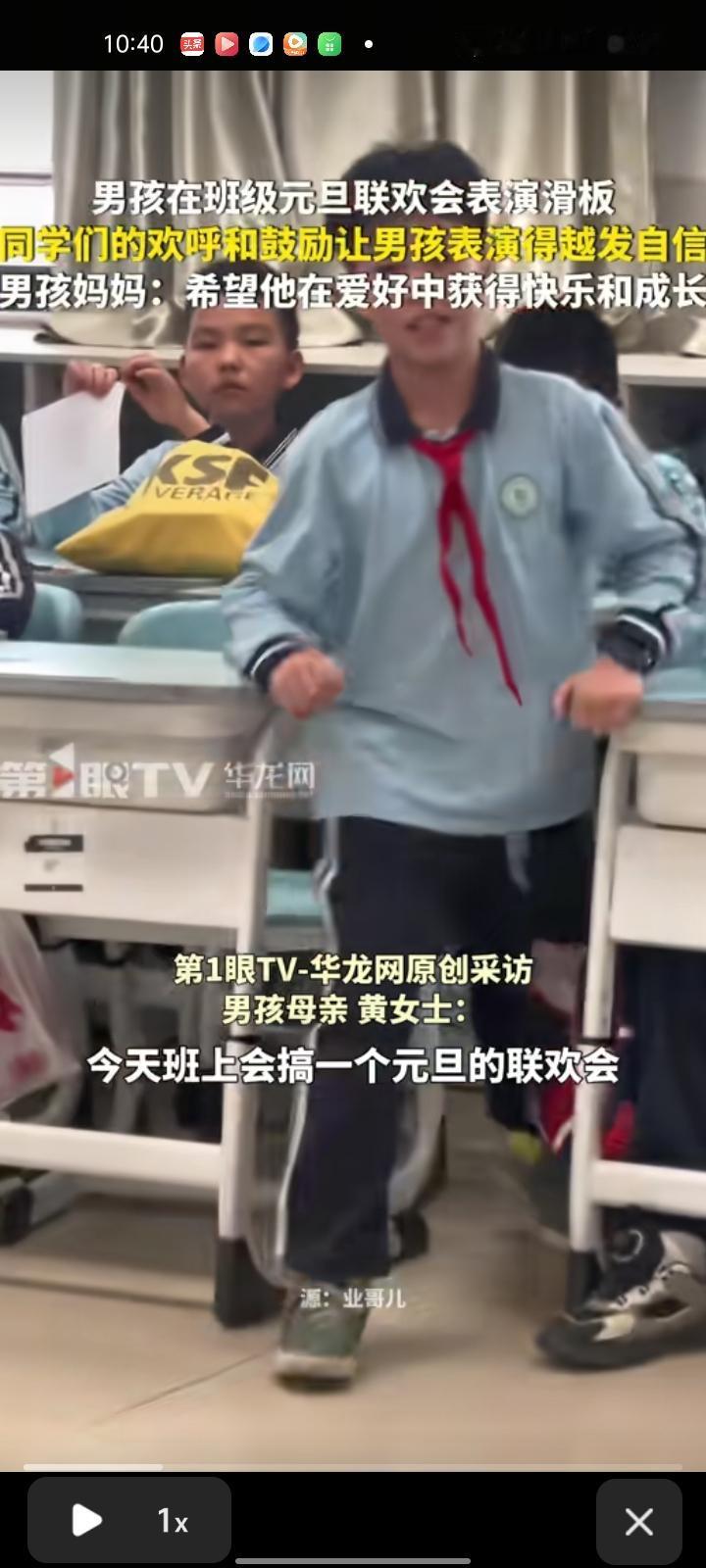 12月31日,广东广州。男孩在班级元旦联欢会上表演滑板,同学们的欢呼和鼓励让男孩表演的越发自信。 孩子妈妈黄女士称,老师在班级群里发通知说,今天要搞一个元旦联欢会,刚好孩子喜欢玩滑板,他也有想要表演的想法,就给他报名了,老师很支持孩子的爱好。 活动当天,他在班级里表演几个动作,同学们非常捧场。最开始他是蛮害羞的,有点不好意思,但是他看到同学们为他鼓掌欢呼,心里是蛮高兴的。