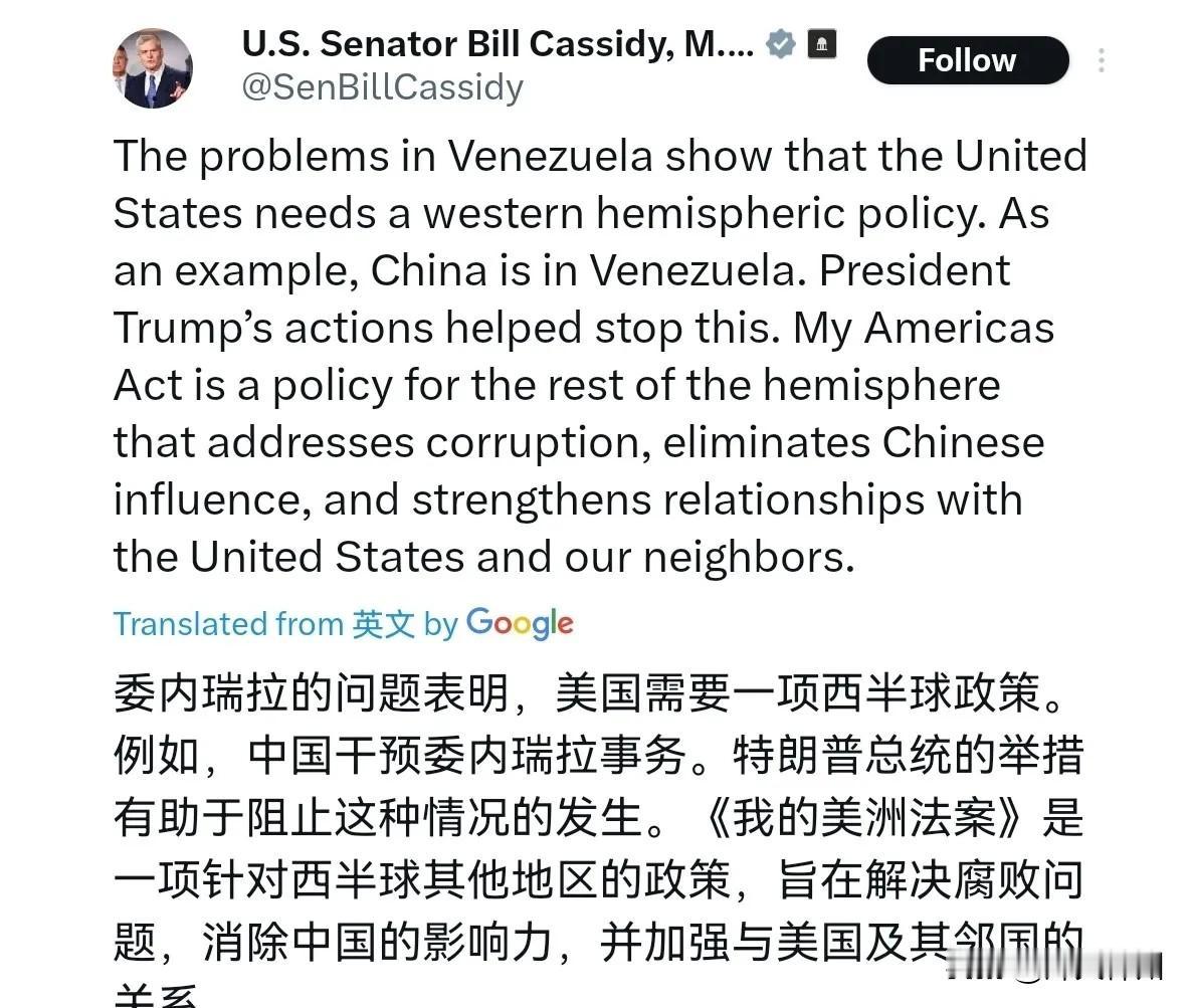 不仅是为了石油,就是要消除中国的影响力,美国毫不掩饰这一点!1月5日,美国参议员比尔·卡西迪表示,委内瑞拉的问题表明,美国需要一项西半球政策。比如,中国在委内瑞拉有着存在,特朗普总统的行动助力阻止了这一态势。我提出的《美洲法案》是面向西半球其他国家的政策,旨在整治腐败、消除中国的影响力,并巩固美国与邻国之间的关系。 评几句: 霸权意图藏不住!美国《美洲法案》剑指中国,拉美不是博弈棋盘 据美国国会官网1月5日公开表态,参议员卡西迪直言,其提出的《美洲法案》旨在整治腐败、消除中国在西半球的影响力,还提及特朗普政府此前相关行动曾助力遏制相关态势。这番表态,彻底撕下了该法案“巩固邻里关系”的伪装。 特朗普政府时期,美国曾针对委内瑞拉出台石油禁运等多项单边制裁措施,如今国会又试图通过立法推进相关议程。美国的一系列动作,背后既有对委内瑞拉丰富石油资源的考量,更有打压中国与拉美国家合作的明确目的。要知道,中委合作始终基于平等互利原则,中国投资建设的能源、基建项目,切实帮助委内瑞拉盘活产业、改善民生,带去的是实实在在的发展机遇,绝非所谓的“政治操控”。 美国口口声声喊着“维护西半球稳定”,实则动辄用单边措施、立法手段干预他国事务,将拉美地区视为地缘博弈的势力范围。所谓“消除中国影响力”,本质上是不愿看到拉美国家根据自身需求自主选择合作伙伴,不愿接受中国靠互利共赢收获认可的事实。 如今,拉美国家追求独立自主发展的呼声日益高涨,这种搞排他性博弈的做法,显然与时代潮流背道而驰。事实已经并将继续证明,靠霸权逻辑推行的单边政策,越来越难获得国际社会认同。