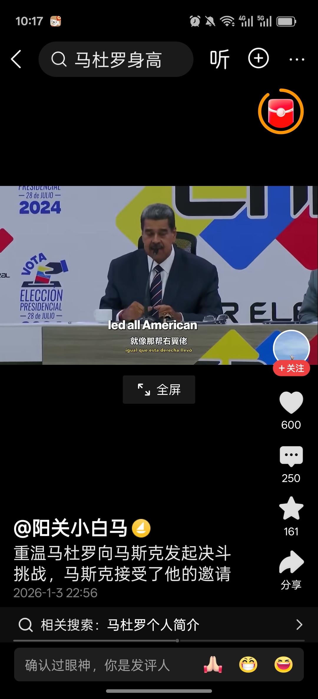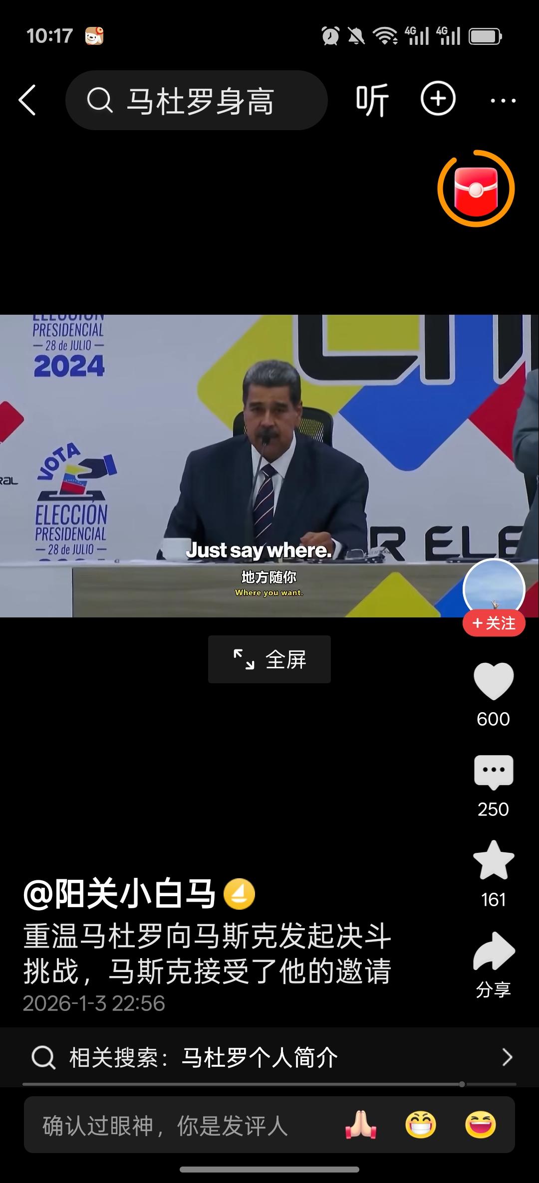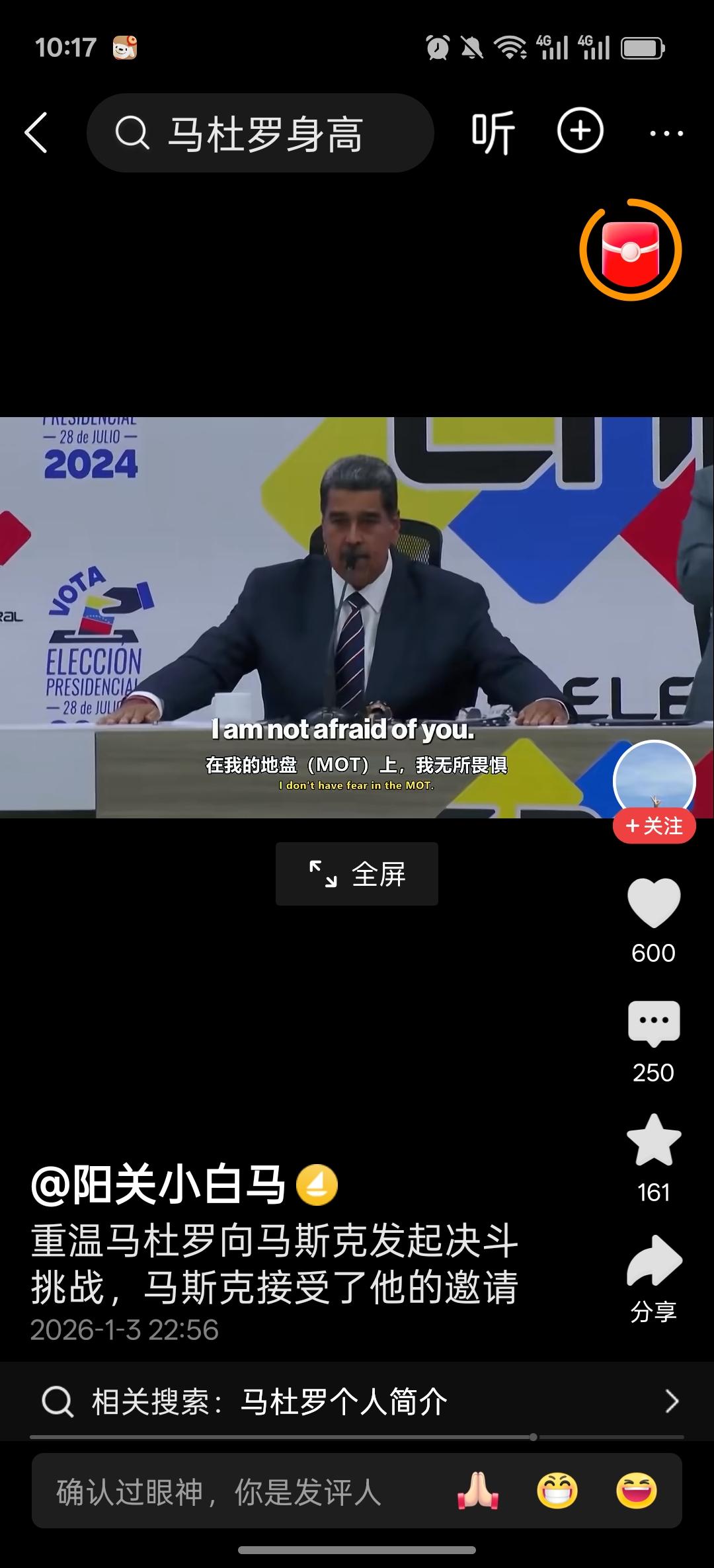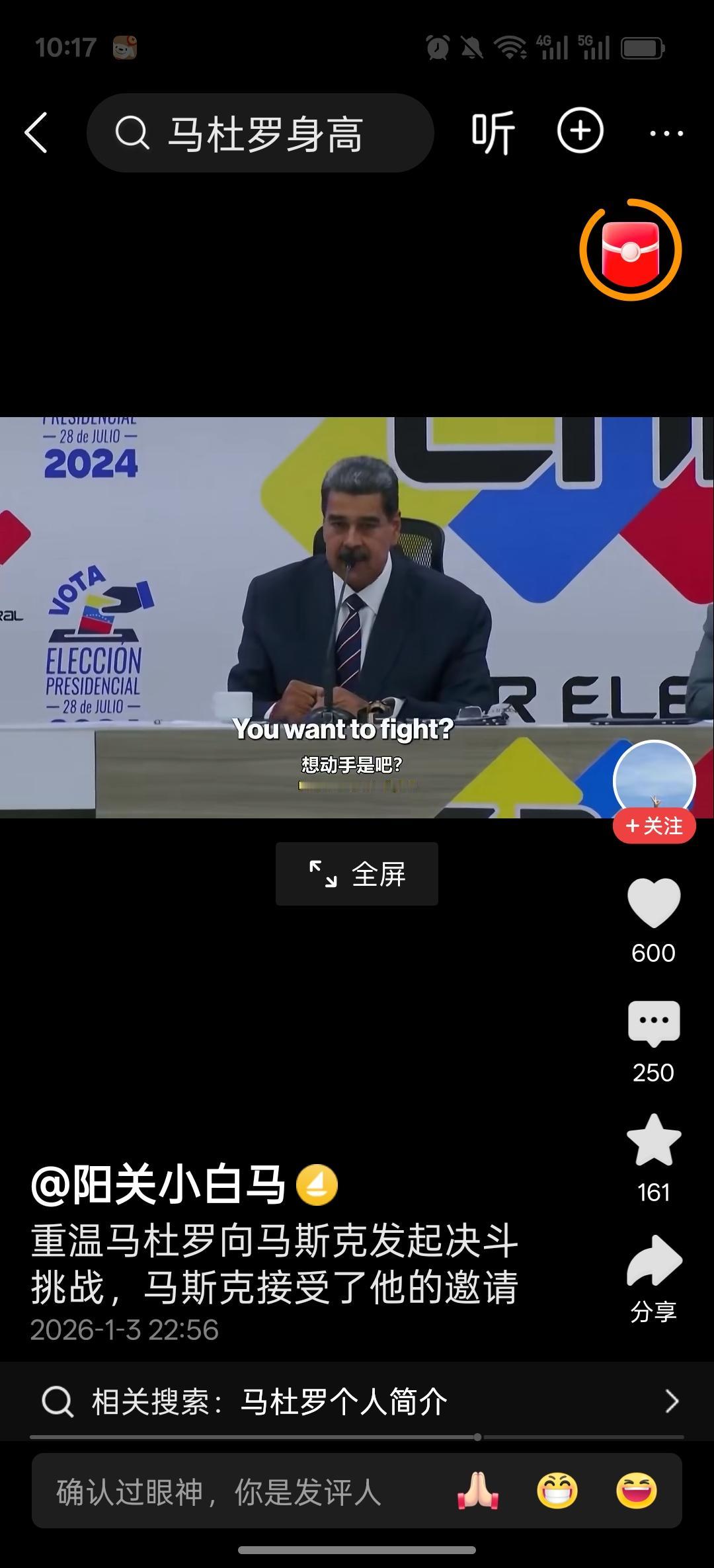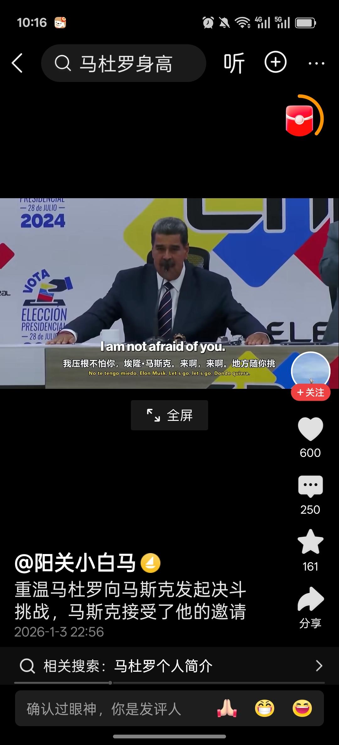 明知山有虎,偏向虎山行 委国总统马杜罗在上次选举中,被本家马斯克批评舞弊,龙颜大怒之后,在电视台公开发出挑战邀请。邀约马斯克在委内瑞拉的任何场合,开展公平决斗。不料马斯克不上钩,只是在社交平台上耍耍嘴炮,不肯到他的地盘去。 这次可能是马杜罗实在忍不住了,主动去了大美丽,真可谓”明知山有虎,偏向虎山行。”或者是"初生牛犊不怕虎?” 也不知道他有没有武松的酒量和武功,别到时候被虎给吃了[星星眼][星星眼][星星眼]