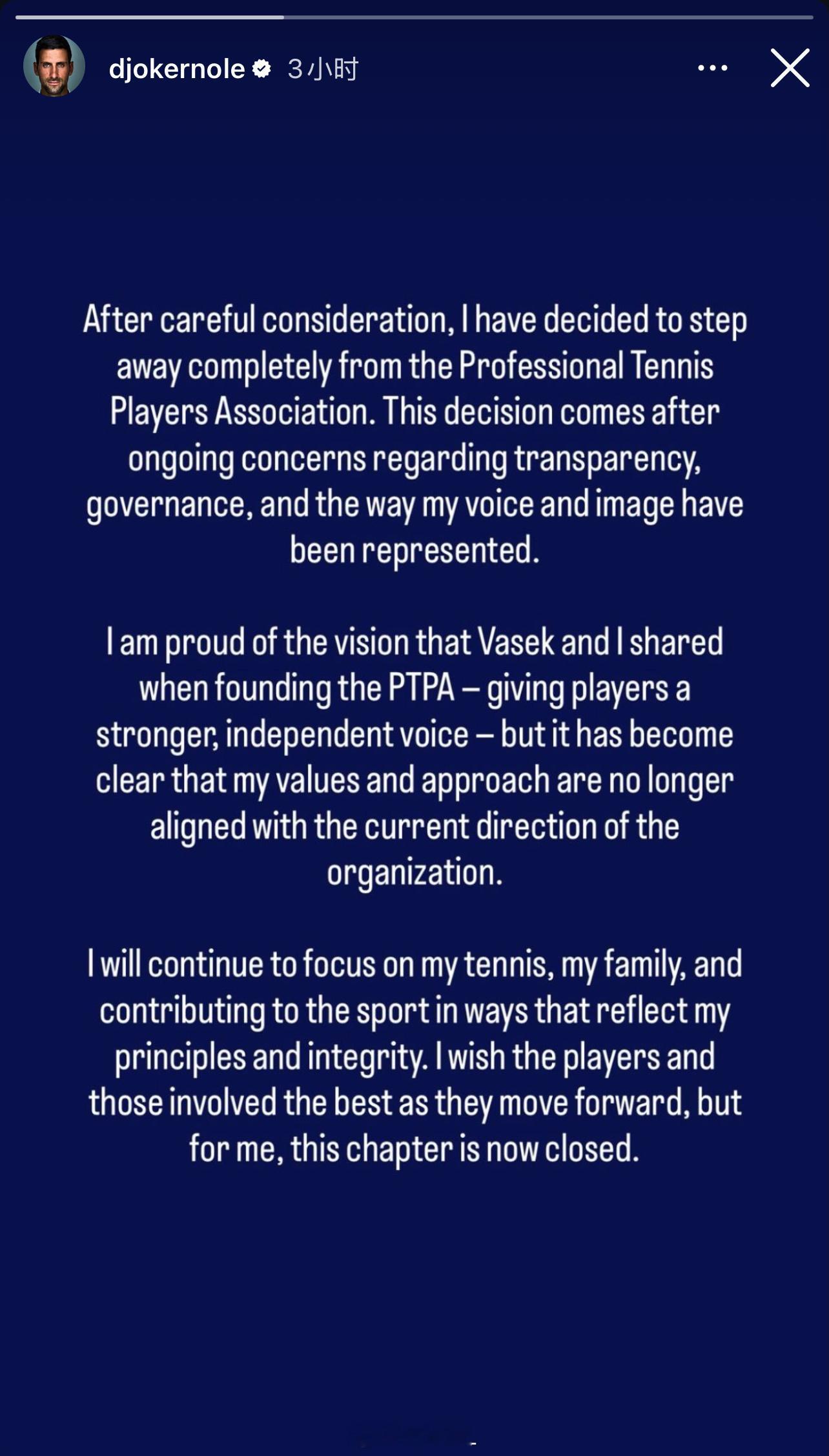 德约科维奇宣布退出PTPA他给出的退出原因主要有以下几点:● 价值观不一致: 他表示,经过慎重考虑,他现在的价值观和行事方法,与PTPA目前的发展方向“不再一致”。● 对管理的担忧: 他长期以来对协会的透明度、管理方式,以及他个人的声音和形象在组织中的呈现方式感到担忧。● 愿景已变: 虽然他为自己当初与人共同创立PTPA时的愿景(赋予球员更强大、独立的声音)感到自豪,但他认为现在是时候翻篇了。● 未来重心: 他明确表示,未来将专注于网球、家庭,并以符合自己原则和正直的方式为这项运动做贡献。年度体育榜样力量体育大赏