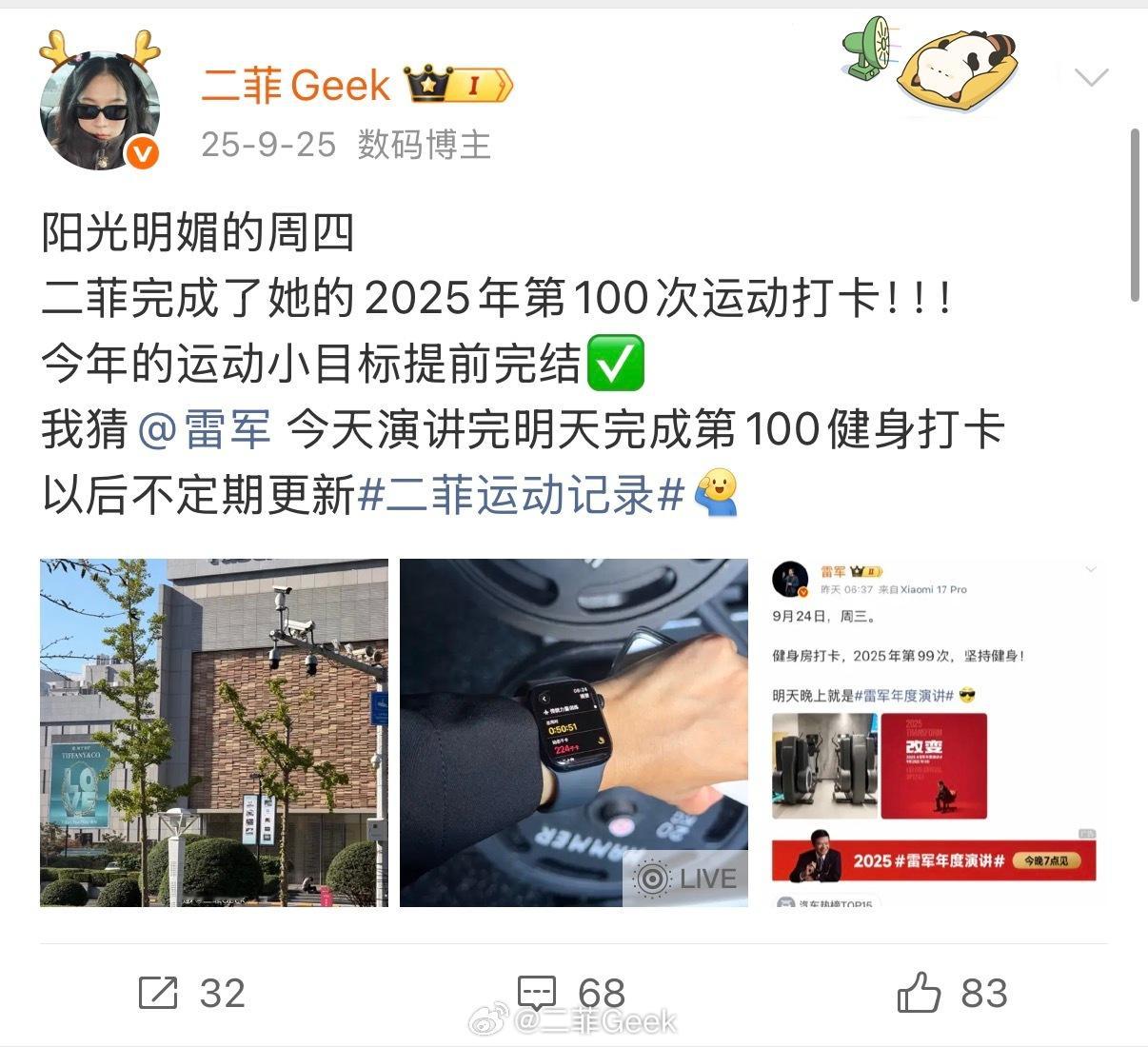 雷军2026年第1次健身房打卡雷哥又开启新一年的健身打卡了(p1我在考虑要不要也跟上来一轮2026年的健身打卡不过说实话去年跟着打卡了100次(p2感觉对我来说有点儿简单了真不是我吹牛我从今年1月1日连续运动到1月4日(p3今天也有运动计划按照这个速度我大概不到4个月就完成100次健身打卡了