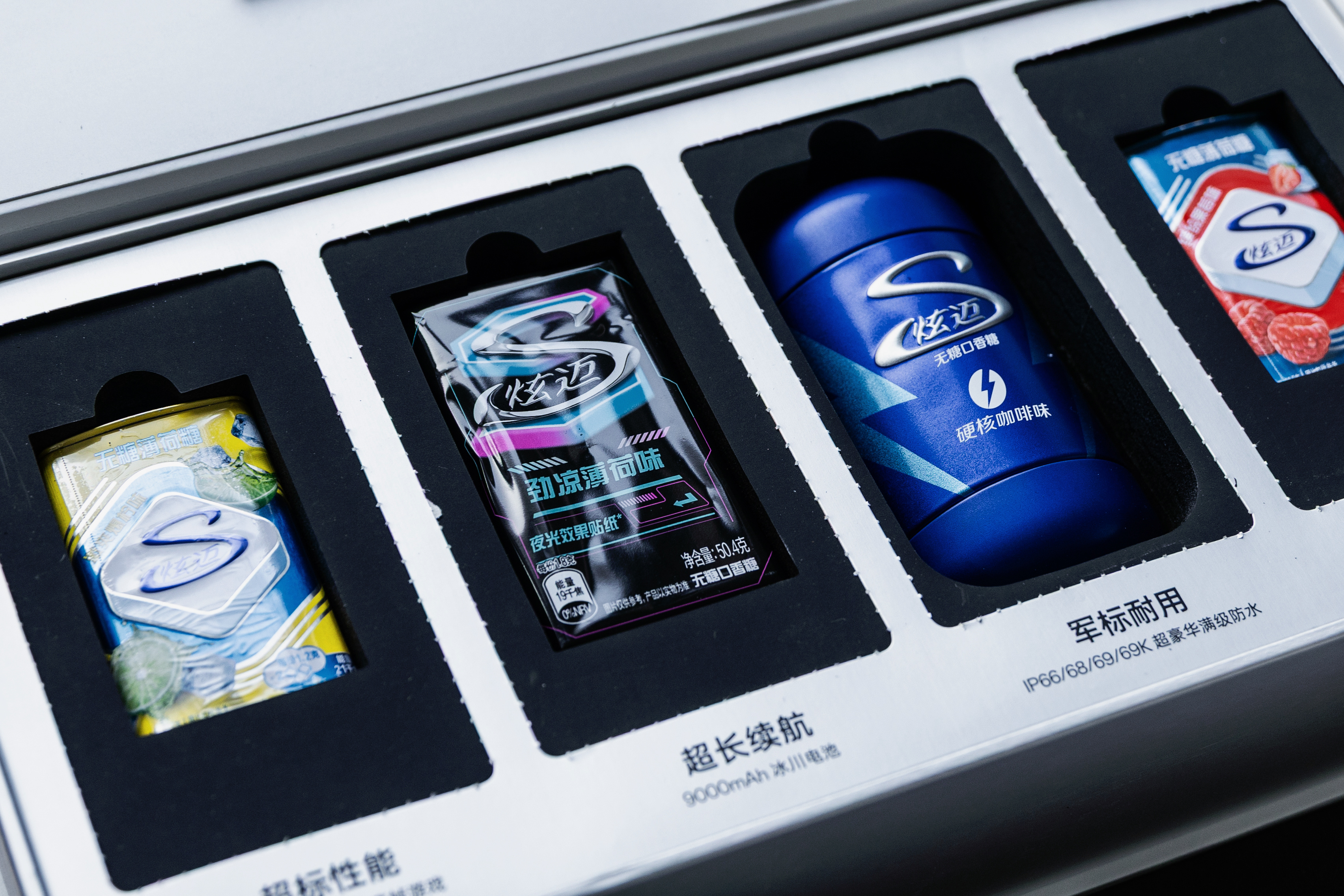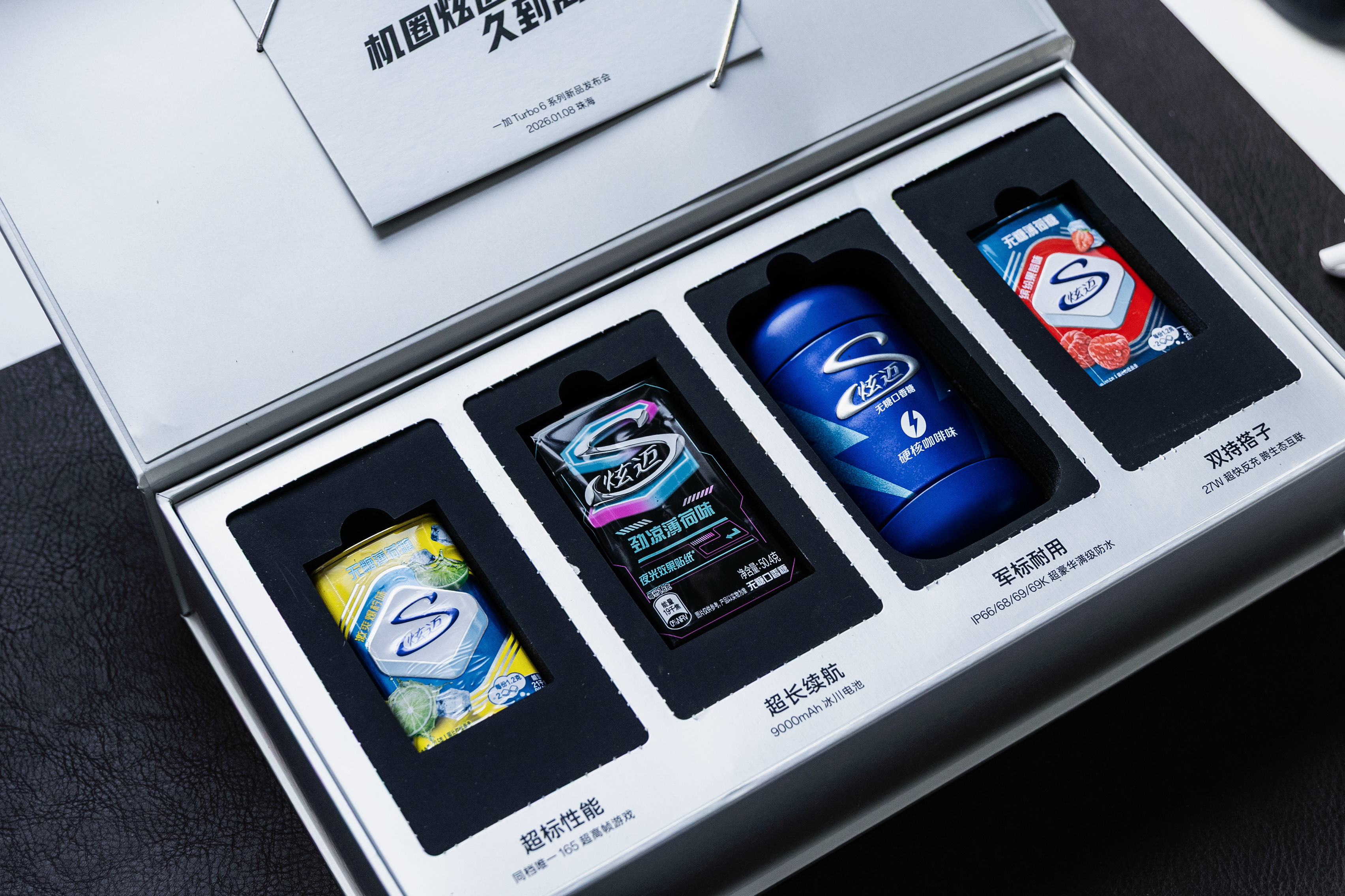 有意思,一加Turbo6这次的邀请函礼盒是一加与炫迈联合定制口香糖,核心卖点对应不同口味,高帧游戏持久流畅,9000大电池久到离谱,军标耐用强到离谱,果味双持爽到停不下来!一加Turbo6机圈炫迈