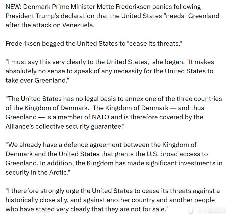 丹麦首相梅特·弗雷德里克森在特朗普总统宣布美国“需要”格陵兰陷入惊慌。弗雷德里克森恳求美国“停止威胁”。“我要非常明确地对美国说,谈论美国有必要接管格陵兰,完全没有任何意义。”“美国没有法律依据去吞并丹麦王国的三个国家之一。丹麦王国——因此格陵兰——是北约成员国,因此受到北约集体安全保障的保护。”“丹麦王国与美国之间已经有一项防务协议,授予美国对格陵兰的广泛访问权。此外,丹麦王国在北极地区的安全上也进行了重大投资。”“因此,我强烈敦促美国停止对这一历史上关系密切的盟友,以及对另一个国家和另一群明确表示‘不出售’的人民的威胁。”