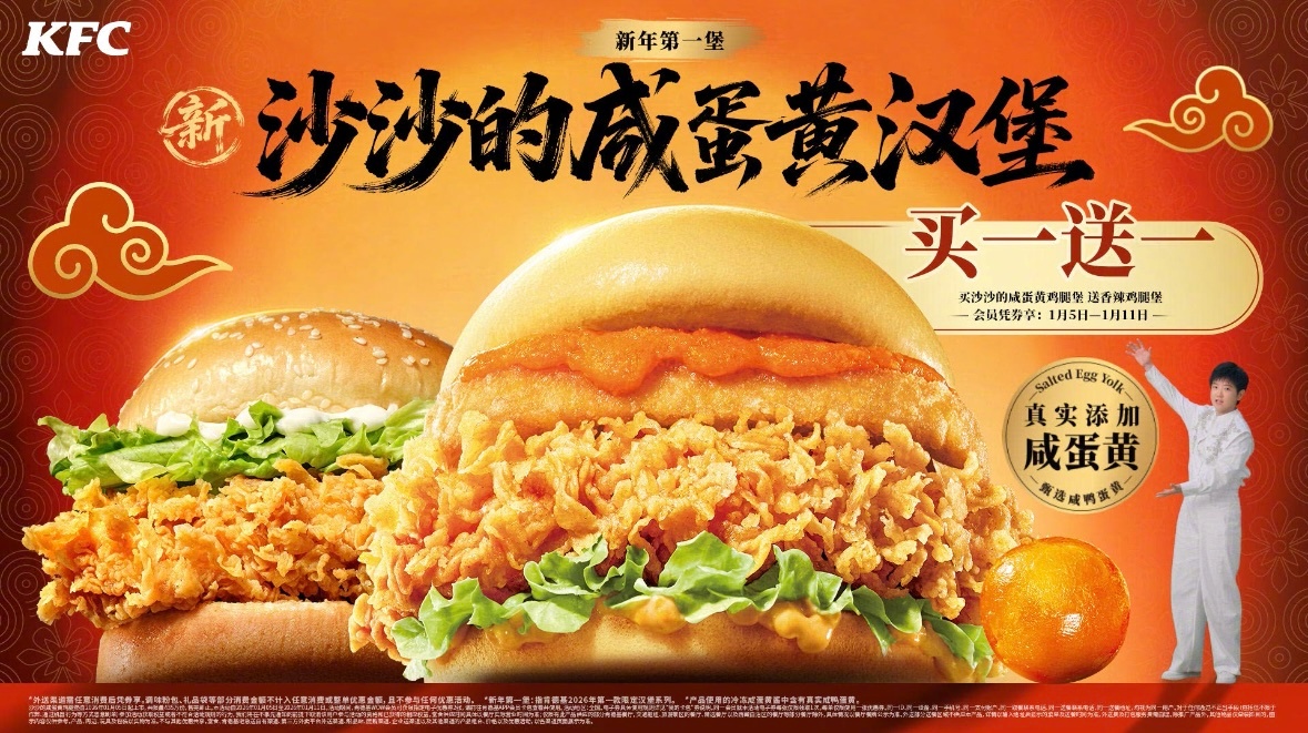 肯德基不仅有沙沙还有莎莎 新年第一堡,就吃沙沙的咸蛋黄鸡腿堡!!肯德基是真的懂谐音梗——代言人孙颖莎×沙沙的咸蛋黄鸡腿堡,这波双厨狂喜直接拉满!每一口都是真实咸蛋黄颗粒,沙沙咸香,咬下去像在嘴里放了一场“元气烟花”~1月5日正式上线,1月5日-11日还有大招:会员凭券享买一送一,买沙沙的咸蛋黄鸡腿堡送香辣鸡腿堡!新年就要“堡”持活力,跟上莎莎的节奏,一起感受沙沙咸香的快乐!