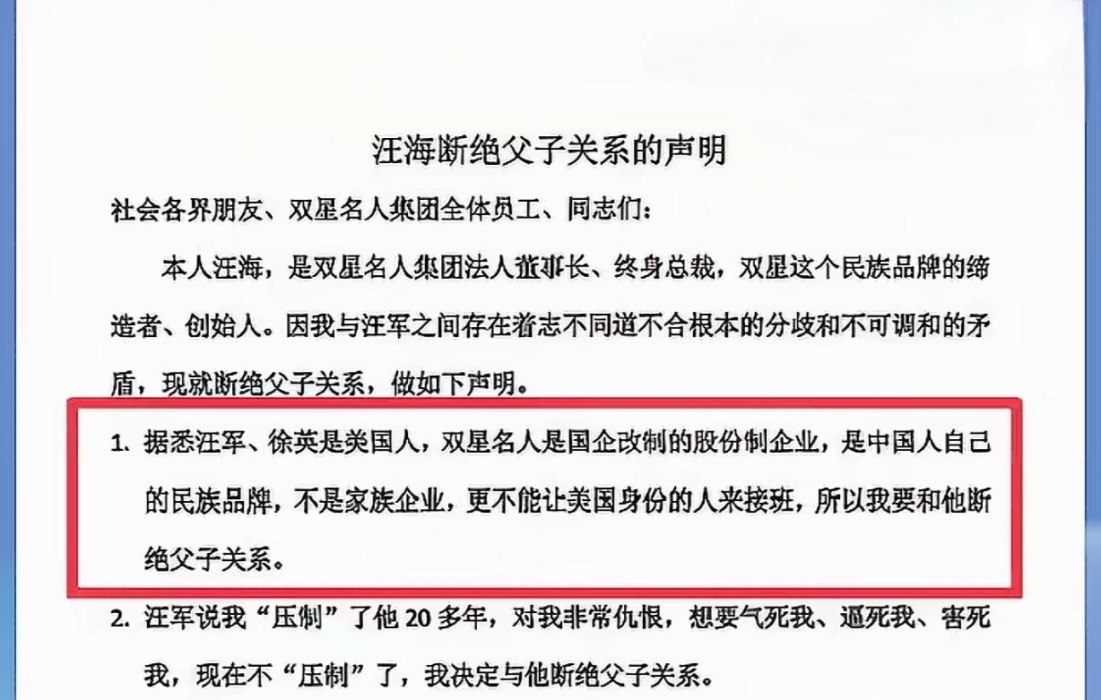 1月4日,84岁的双星创始人汪海发布公开信,宣布与儿子汪军、儿媳徐英断绝关系。 中国第1代企业家的接班人之路在最近几年频繁出现新的现象。 娃哈哈的21亿美金信托还没有结束,双星创始人汪海与儿子汪军的接班人纠纷又出来了。 不过这次必须得为汪老爷子点个赞,表明绝不能让“美国身份的人”接班。并且表明虽然双星是由国企改制的股份制企业,但不是家族企业,是中国人自己的民族品牌。 大家认同汪老爷子的做法吗? 双星名人创始人汪海与儿子断绝关系