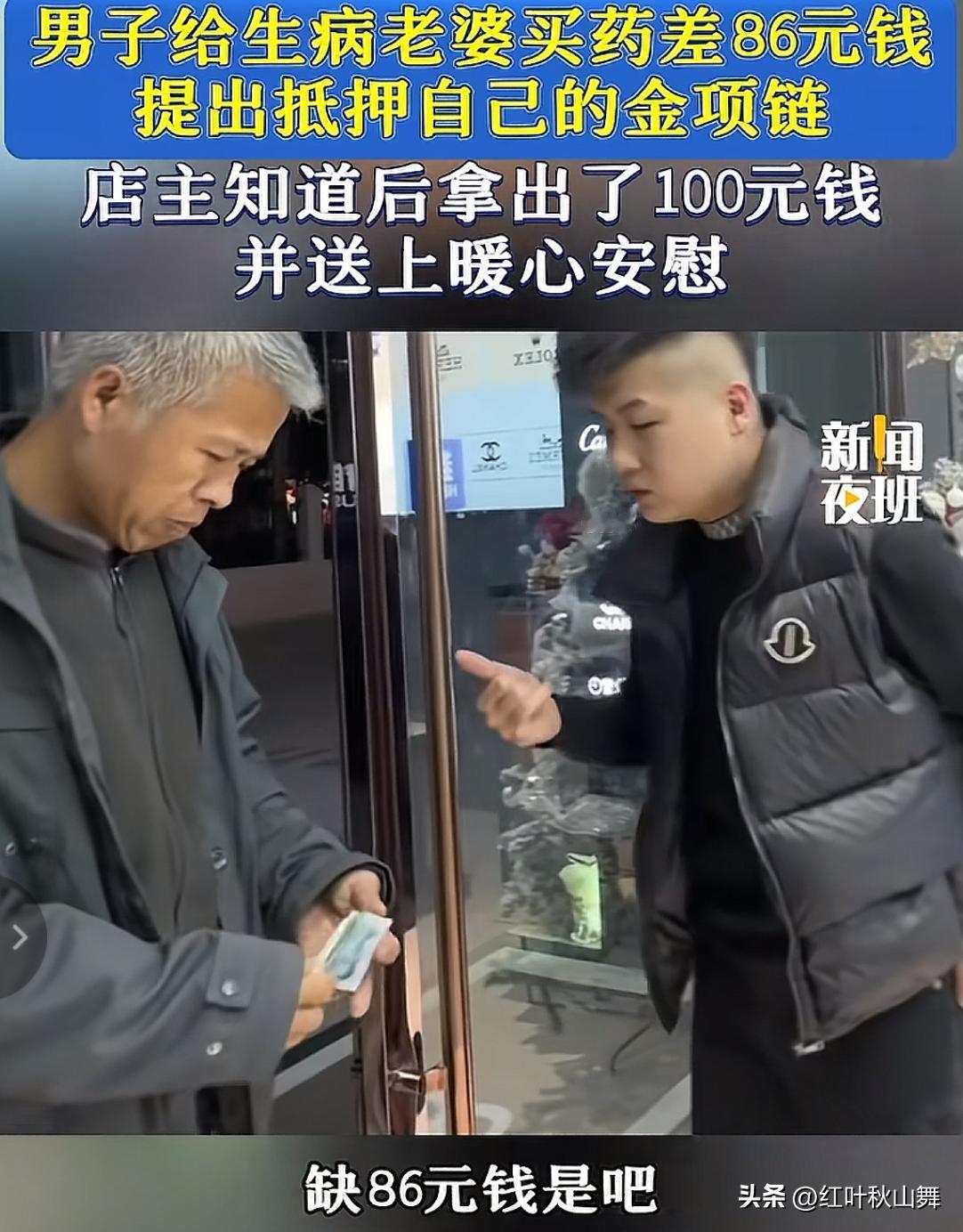 “老板,能不能借86块钱,我给妻子买药,我用项链抵押。”一位头发花白的大哥,局促地在门口问道。此时,山西运城的王先生正在跟妻子在店中吃饭,一个中年人走了进来,发生了开篇的一幕。这很突然,王先生两口子没有准备,有点惊讶和意外。但王先生还是站起身来询问怎么回事?那个大哥递上手中的金项链,说要给妻子买药,但他手中现在只有21块钱;他在工地打工,包工头没发工资,但妻子的药不能停。没有办法之下他拿着妻子的项链,想借钱买药,等工资发了再来赎回。他说已经找了三家店了,但都被拒绝,怕他是骗子,怕他手中的项链是假的。说着说着就哽咽了起来,但他一个劲地保证,说自己才43岁,身体很好,能打工挣钱,请老板放心,他一定能还上!王先生突然面对这种情况,属实有些懵,愣在那里没反应。大哥见此以为他也不愿意,就难过的转身走了。王先生看着大哥离去的背影和他才43岁就满头花白的头发,一下子就反应了过来。赶忙回到柜台里去拿了一百钱追了上去。大哥看见王先生递过来的钱,不知是感动还是心酸,忍不住摸起了眼泪。嘴里不停地感谢,说三天,三天之内他一定来还钱…王先生忙安慰他,说不要介意,谁都有遇到难处的时候,赶紧先去把药买了。送走大哥,王先生感触良多,感叹人生不易,于是从监控中把这段视频发了出来,看得网友们心酸不易。40出头,满头白发,深夜四处为病妻筹钱买药,而难倒他的,仅仅是86块钱!可以想象,发生在他身上的苦难必定不少,但他依然在努力的在支撑起一个家,那头银发就是证明!