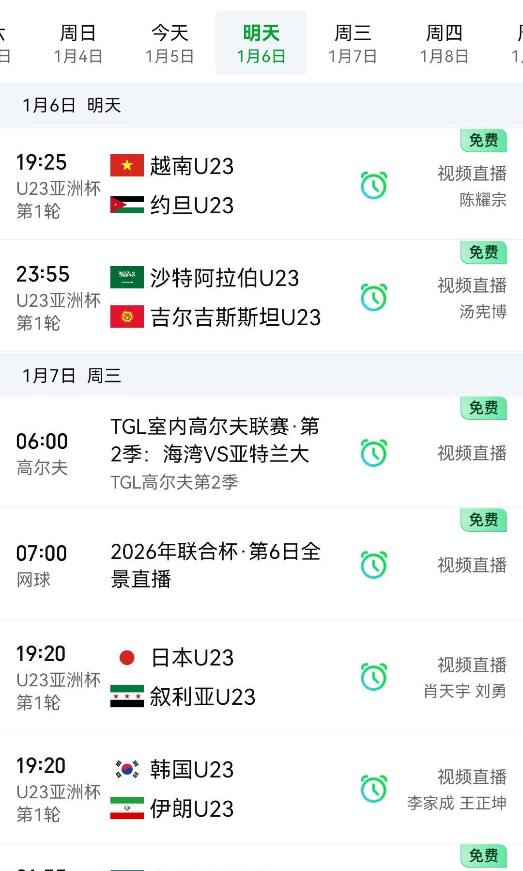 爱奇艺体育免费直播,CCTV5暂无直播安排,2026年U23亚洲杯北京时间1月6日明晚开战,爱奇艺这次太好了,还以为要花钱,刚刚查了一下,是免费直播,球迷们又可以看球啦!中国U23首战是1月8日(周四)22:00对阵伊拉克,希望中国U23国足拿下开门红!中国队想要出线,必须拿下伊拉克,最少也要打平,因为第二场澳大利亚实力最强,中国队取胜很难,最弱对手是最后一场的泰国队,首战可以说就是决战了,谁胜谁就有机会争得出线优势了,中国队加油!让我们拭目以待吧!