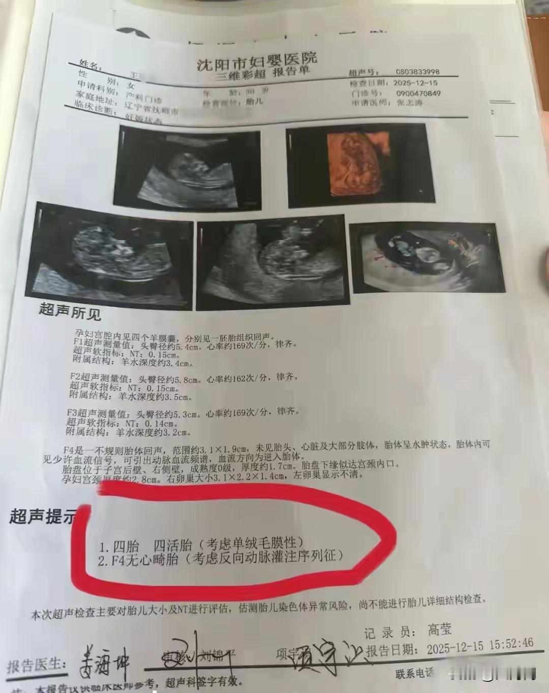 一孕妇两个月内从一胎到四胞胎,每次产检都多出一个宝宝!医生震惊:同卵四胞胎,概率竟然高达1300万分之一近日,辽宁抚顺一位名叫王女士的特殊孕事火爆网络:她在短短两个月内,四次产检却发现胎儿由最初的一胎,竟然“奇迹般”增加到四胞胎!更令人惊讶的是,这四胞胎竟然是同卵怀孕——这在人类怀孕史上少之又少的罕见奇迹,概率约为1300万分至1500万分之一,堪称“生命界的超级彩蛋”! 想象一下,从怀孕第一天到两个多月后,腹中的“小家庭”逐渐扩充,原本仅有一个生命的温暖港湾,最终摇身一变成了四个小天使的萌芽阵地。每一次产检时,医生还要密切关注,确认多出的胎儿是否健康,有没有畸形。令人遗憾的是,第四个胎儿被诊断为“无心畸胎”,这让医生和家属都心头一紧。 而这背后,藏着医学的挑战与家庭的担忧。医生坦言,同卵四胞胎本就极其罕见,每一位孕育者的身体条件都在经历着巨大的考验。更为复杂的是,若其中一个胎儿出现异常,医护团队要紧急评估是否干预、如何保障母体以及其他胎儿的安全。这也提醒我们,现代医疗技术虽日新月异,但生命的奇迹依然满含未知与风险。 王女士的故事令人深思:“生命真的充满了不可思议的可能。”对于普通孕妈来说,这无疑是一场从平凡到非凡的“生命奇观”旅行。而对于我们每个普通人,这也让我们重新认识到生命的珍贵与脆弱。 网友们看后纷纷留言表达惊叹与祝福:“这命运的惊喜堪比中彩票!”“真希望母子平安,这可是上天赐予的特殊考验”……从这里,我们看到更多的是对生命的尊重与对医学力量的信任。 这起事件不仅是一次医学上的罕见案例,更深刻反映出生命的韧性、命运的捉弄以及家庭的无私守望。每个生命的诞生都是一场奇迹,更是一段充满期待与挑战的旅程。 愿王女士和宝宝们平安健康,也希望每一个孕妈都能在科学的呵护下,安心迎接属于自己的生命奇迹!你有什么想说的?你身边有没有类似的惊奇故事?评论区等你来吐槽,来点赞,一起为生命喝彩!双胞胎产妇 一胎四姑娘 三胞胎怀孕