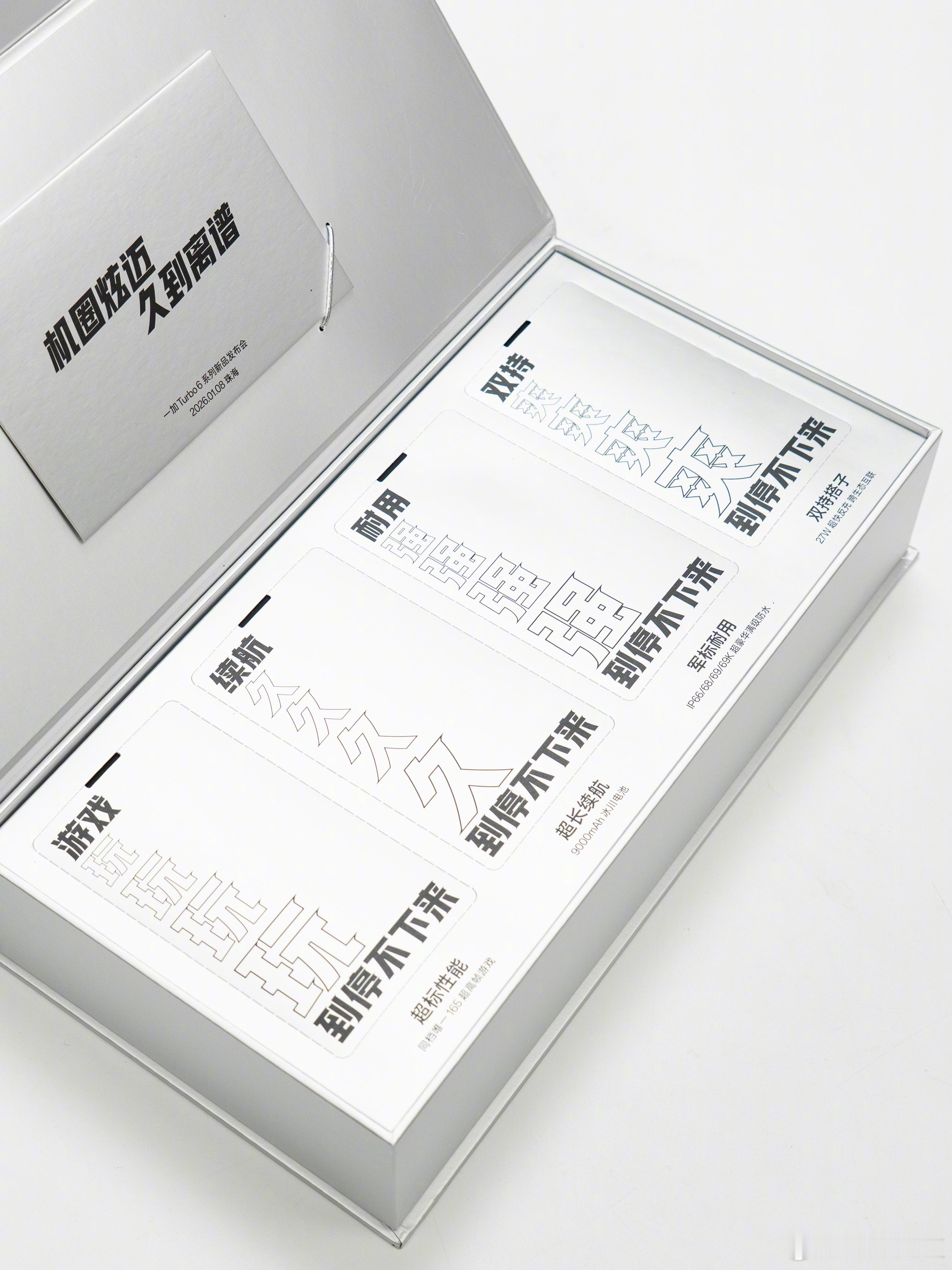 好组合,一加+炫迈,玩到根本停不下来!一加Turbo 6系列号称「机圈炫迈」。主打亮点165超高帧游戏持久流畅、9000mAh冰川电池超长续航、IP66/68/69/69K满级防水军标耐用、27W反向充电苹果双持搭子。一加Turbo6机圈炫迈