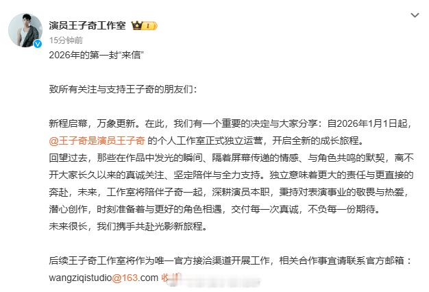王子奇个人工作室独立运营独立运营官宣!王子奇将以工作室为依托,自主规划演艺方向