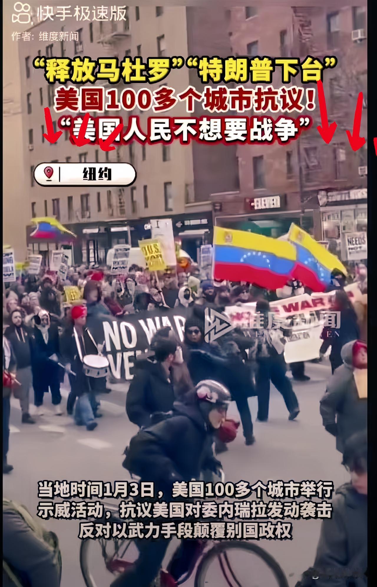 最近美国可闹开了! 看看特朗普怎么收场! 当地时间1月3日,纽约等一百多个城市的民众走上街头抗议,手里举着委内瑞拉国旗,喊着“释放马杜罗”“特朗普下台”的口号。 大家不满美国对委内瑞拉发动袭击,更反对用武力去颠覆别国政权,纷纷喊出“美国人民不想要战争”的心声。这场遍布全美多地的抗议,也让外界看到美国民众对政府对外武力政策的强烈不满。 其实在大街上抗议有什么用呢?有胆量他们冲进白宫把特朗普拎出来踩扁。你们说呢?