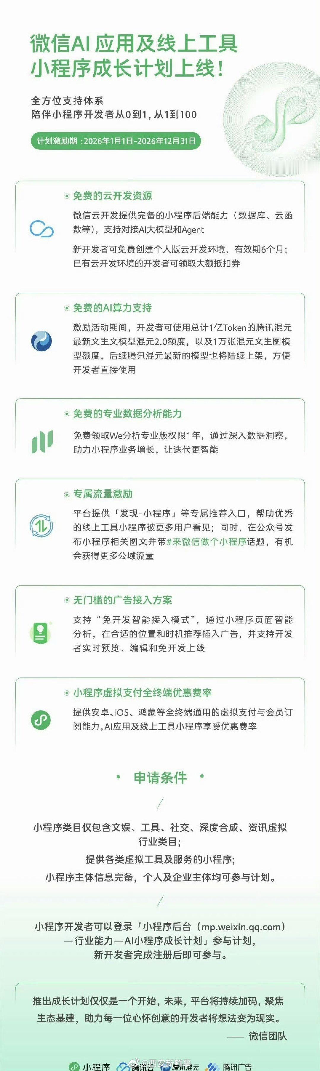 【微信发布AI小程序成长计划】微信发AI小程序成长计划1月5日,据微信公开课公众号:微信小程序正式推出「AI应用及线上工具小程序成长计划」。提供云开发资源、AI算力、数据分析、商业变现及流量激励等全方位支持,陪伴开发者完成从“0到1”再从“1到100”。成长计划的激励期为2026年全年(2026年1月1日至2026年12月31日),平台通过开发、运营、变现等核心扶持携手开发者开启小程序AI应用元年。